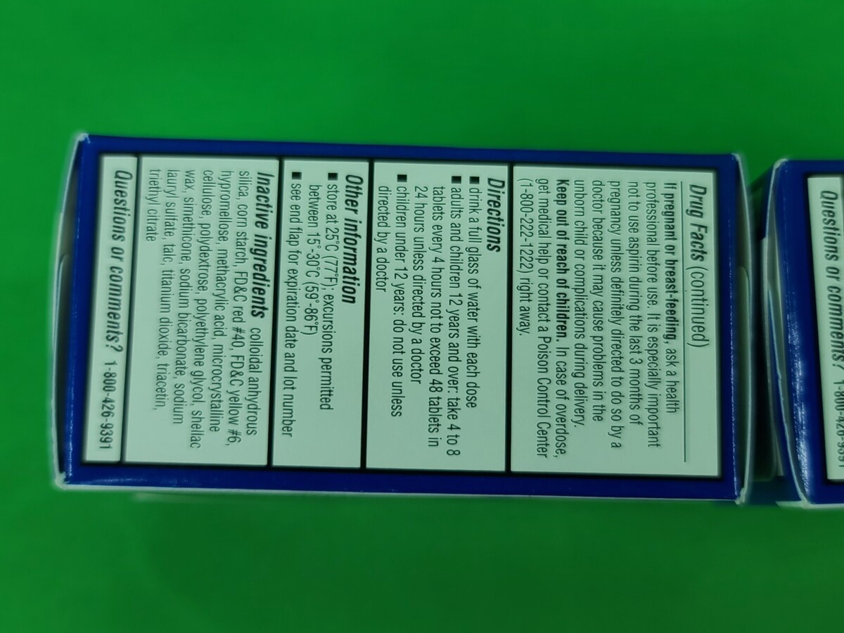 Drink a full glass of water with each dose. Adults and Children 12 Years and Over: Take 4 to 8 tablets every 4 hours, not to exceed 48 tablets in 24 hours unless directed by a doctor. Children Under 12 Years: Consult a doctor. Store at room temperature 59-86 degrees F (15-30 degrees C). Avoid high humidity and excessive heat (40 degrees C).