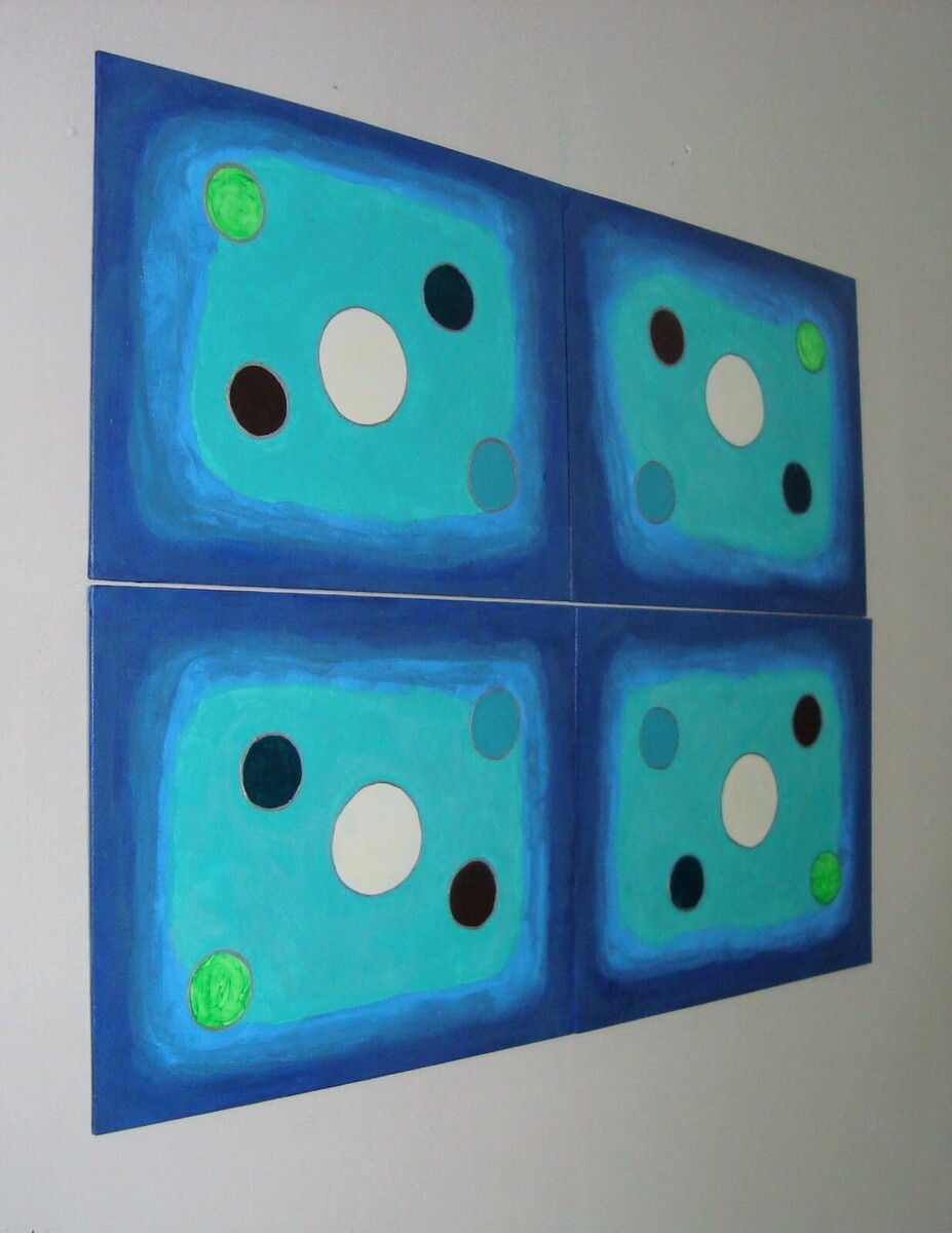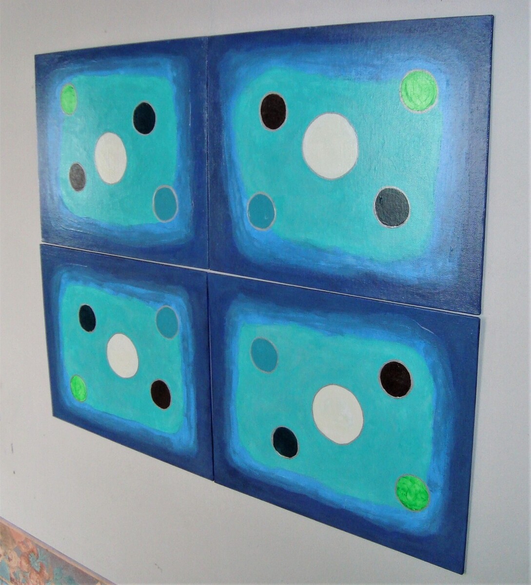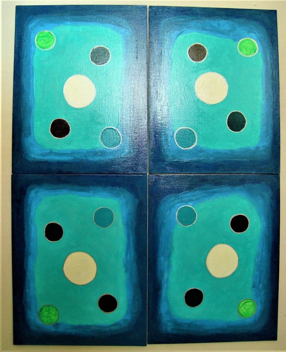 Isolation Circles in the Park' by Carla Dancey. The circles are in white, forest green, seafoam green, lime green and brown on a light aqua background surrounded by a muted or greyed navy blue. Each isolation circle has a circle around it in metallic silver. Make your space coordinate perfectly with these bold, colorful paintings. They can be used to create coordinated focal points and accents throughout your space. These would be great in an office or in any room where you want to create a professional, complimentary ensemble. This set of four original acrylic paintings can be hung together to make a larger painting, behind a couch, for example. Or, they can be hung individually around your space. Each painting is on an 11" x 14" strong, durable, pet and child friendly canvas board. If they are hung as one painting, it will cover a minimum surface area of 22" x 28". The artworks have had three coats of protective high gloss varnish coating applied for years of added protection. Each painting is titled and signed on the back. The paintings comes with hangers attached so that you can hang them with or without frames.