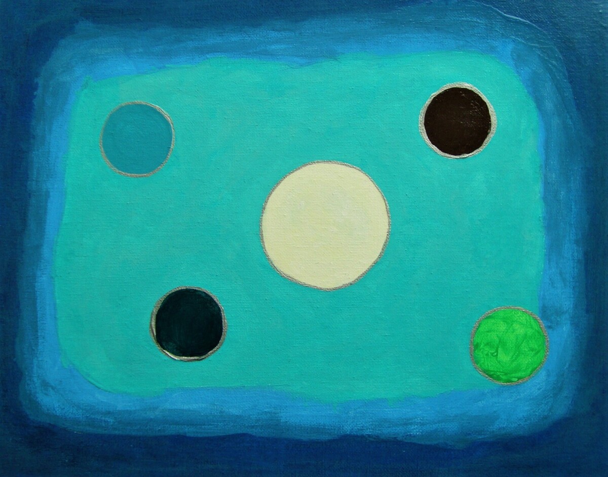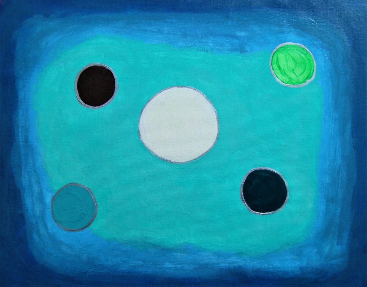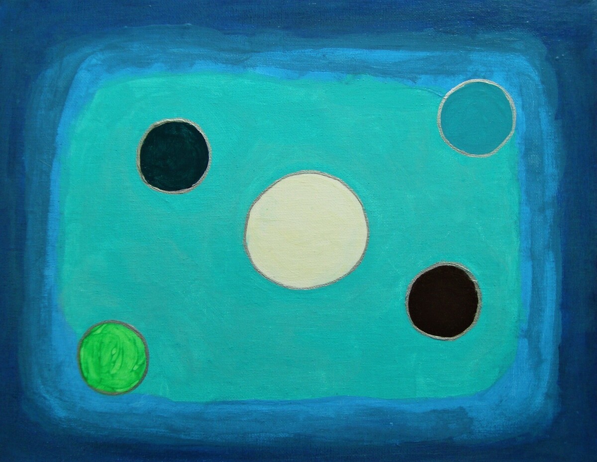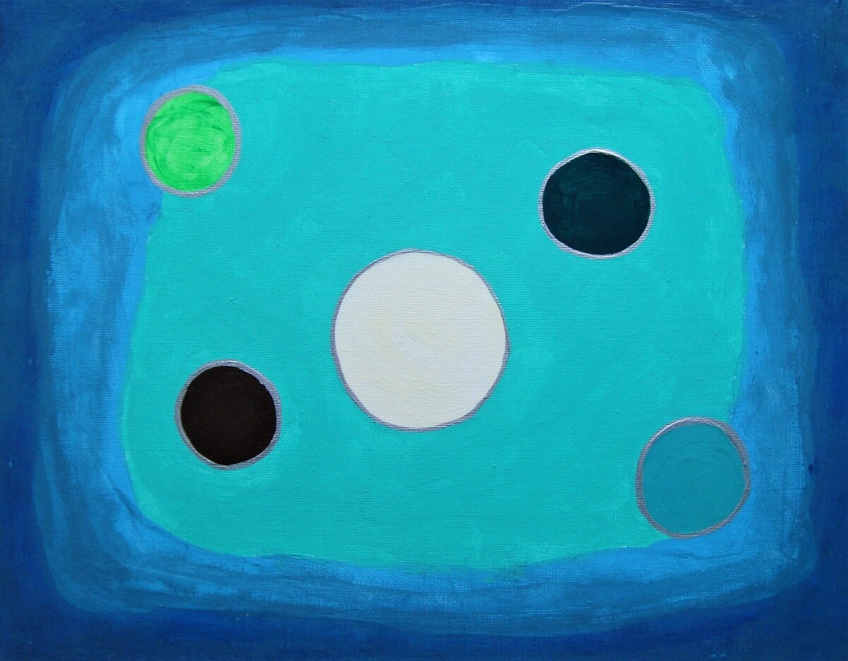 Isolation Circles in the Park' by Carla Dancey. The circles are in white, forest green, seafoam green, lime green and brown on a light aqua background surrounded by a muted or greyed navy blue. Each isolation circle has a circle around it in metallic silver. Make your space coordinate perfectly with these bold, colorful paintings. They can be used to create coordinated focal points and accents throughout your space. These would be great in an office or in any room where you want to create a professional, complimentary ensemble. This set of four original acrylic paintings can be hung together to make a larger painting, behind a couch, for example. Or, they can be hung individually around your space. Each painting is on an 11" x 14" strong, durable, pet and child friendly canvas board. If they are hung as one painting, it will cover a minimum surface area of 22" x 28". The artworks have had three coats of protective high gloss varnish coating applied for years of added protection. Each painting is titled and signed on the back. The paintings comes with hangers attached so that you can hang them with or without frames.