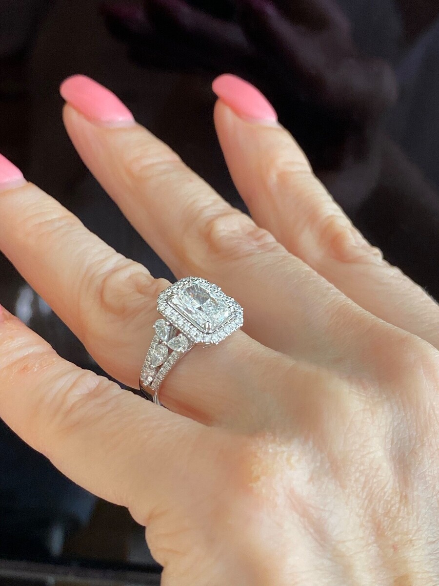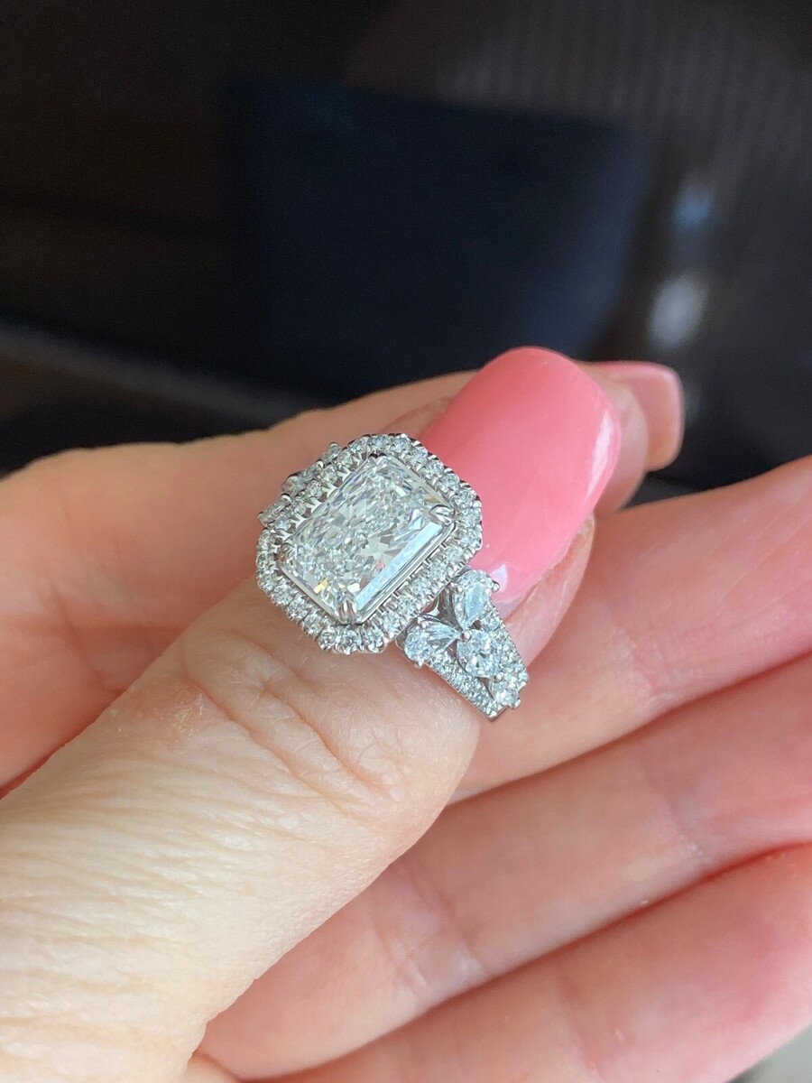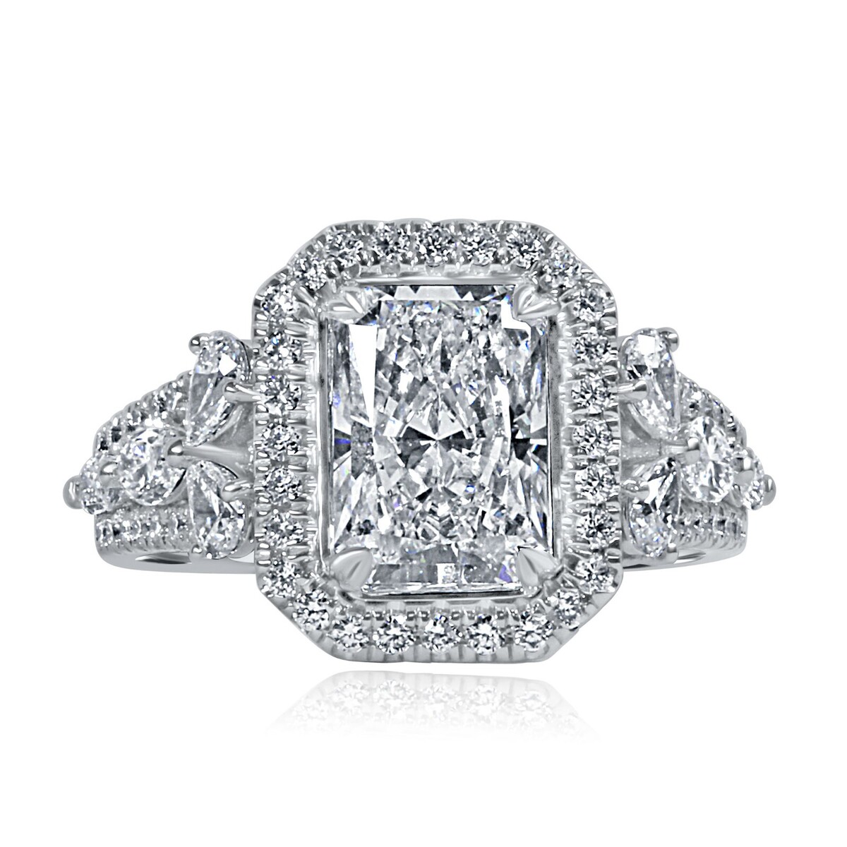 Questo splendido anello di fidanzamento mette in mostra un diamante coltivato in laboratorio radiante abbagliante da 2,02 carati, certificato da IGI per la sua qualita eccezionale. La pietra centrale radiante e circondata da un delicato alone di diamanti a taglio rotondo, aggiungendo brillantezza e dimensione. Il design a gambo diviso e adornato con diamanti aggiuntivi, con complessi grappoli di pere e diamanti tagliati a marchese immersi tra. Tutti i diamanti sono sapientemente messi in oro bianco 14k, creando una miscela armoniosa di eleganza moderna e bellezza senza tempo, rendendo questo anello un simbolo indimenticabile dell'amore. I nostri prodotti sono tutti realizzati a mano con qualita e cura, nel cuore del Diamond District in 47th Street a New York City. La nostra dedizione e imp