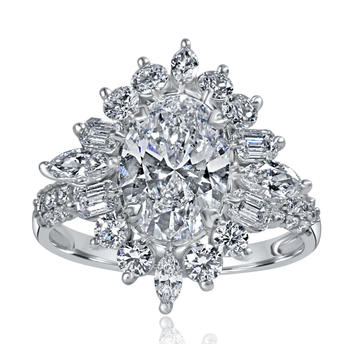 This vintage-inspired diamond engagement ring showcases a stunning 2.04 carat IGI certified D color VVS2 clarity oval cut diamond at its center. Surrounding the centerpiece are meticulously arranged marquise and emerald cut diamonds in a radiant sunburst pattern, creating an air of timeless elegance. Set in 14k white gold, this ring exudes both sophistication and brilliance, making it a perfect symbol of love and commitment for those who appreciate classic design with a modern touch.
