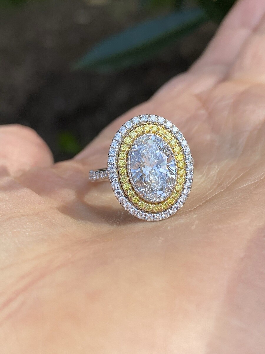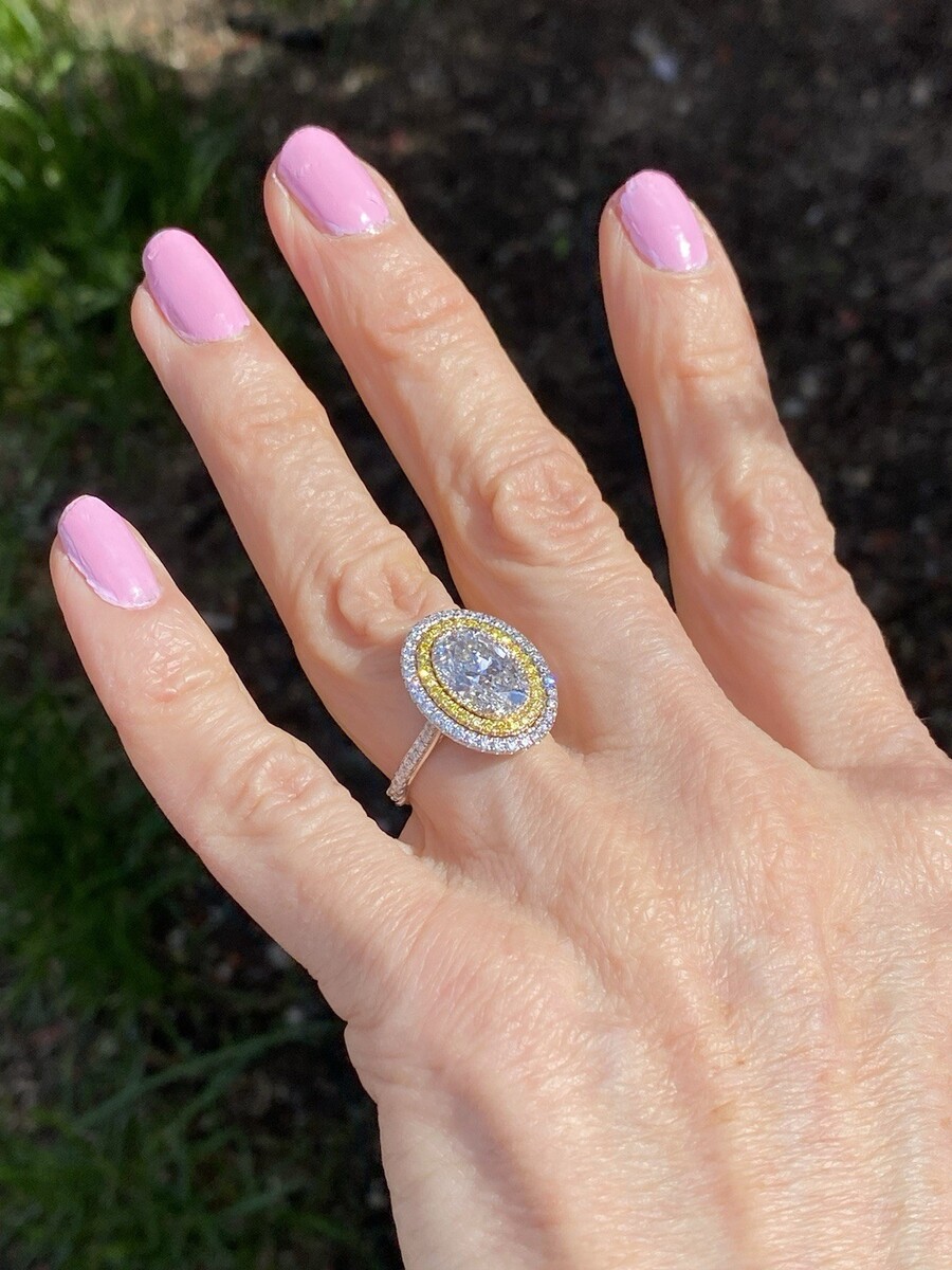 This magnificent engagement ring is handcrafted in 14K white gold and features a stunning 2.09-carat oval brilliant-cut lab-grown diamond, graded D color and VVS2 clarity. A dazzling double halo of yellow and colorless round diamonds enhances the center stone?s brilliance. The diamonds continue along the pave-set band and gallery, creating a breathtaking and radiant design that exudes elegance from every angle.