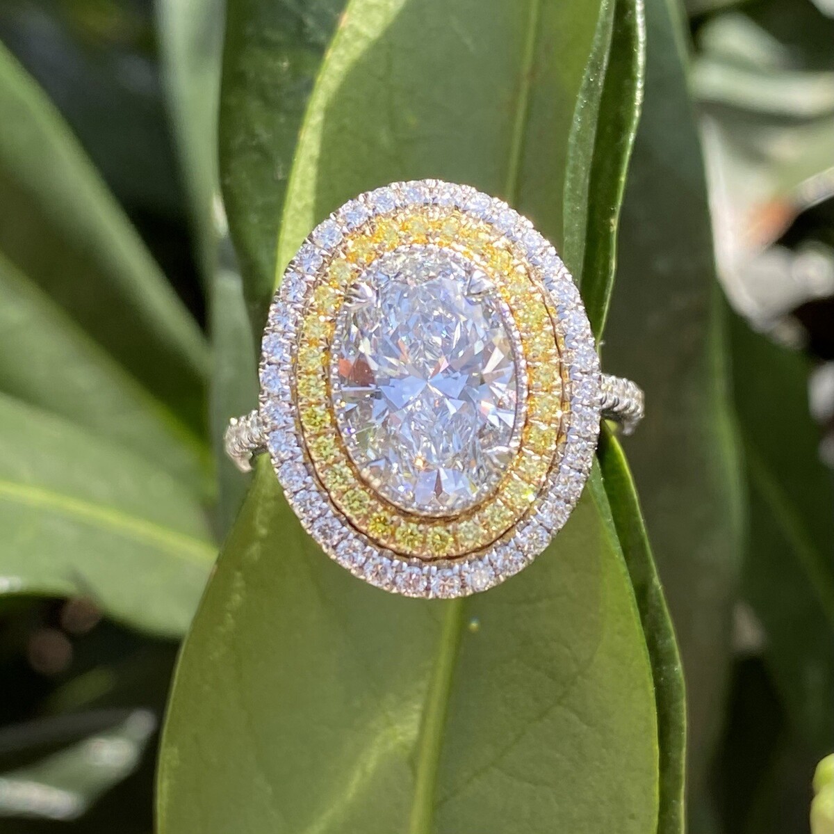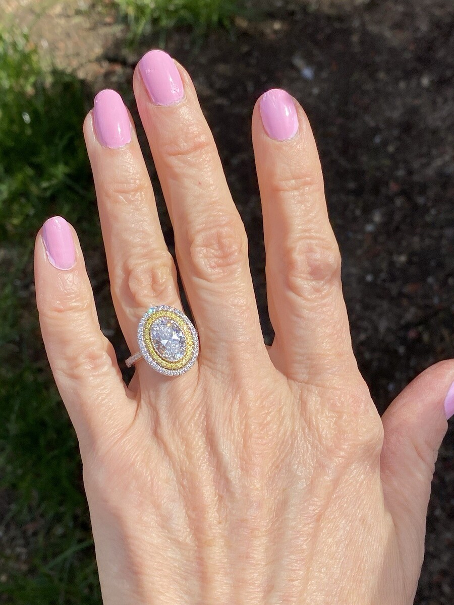 Dieser prachtige Verlobungsring ist handgefertigt aus 14-karatigem Weißgold und verfügt über einen atemberaubenden ovalen, im Labor gezüchteten Diamanten im Brillantschliff von 2,09 Karat, der Farbskala D und der Reinheit VVS2. Ein schillernder doppelter Heiligenschein aus gelben und farblosen runden Diamanten verstarkt die Brillanz des Mittelsteins. Die Diamanten setzen sich entlang des Pave-gefassten Bandes und der Galerie fort und schaffen ein atemberaubendes und strahlendes Design, das aus jedem Blickwinkel Eleganz ausstrahlt.