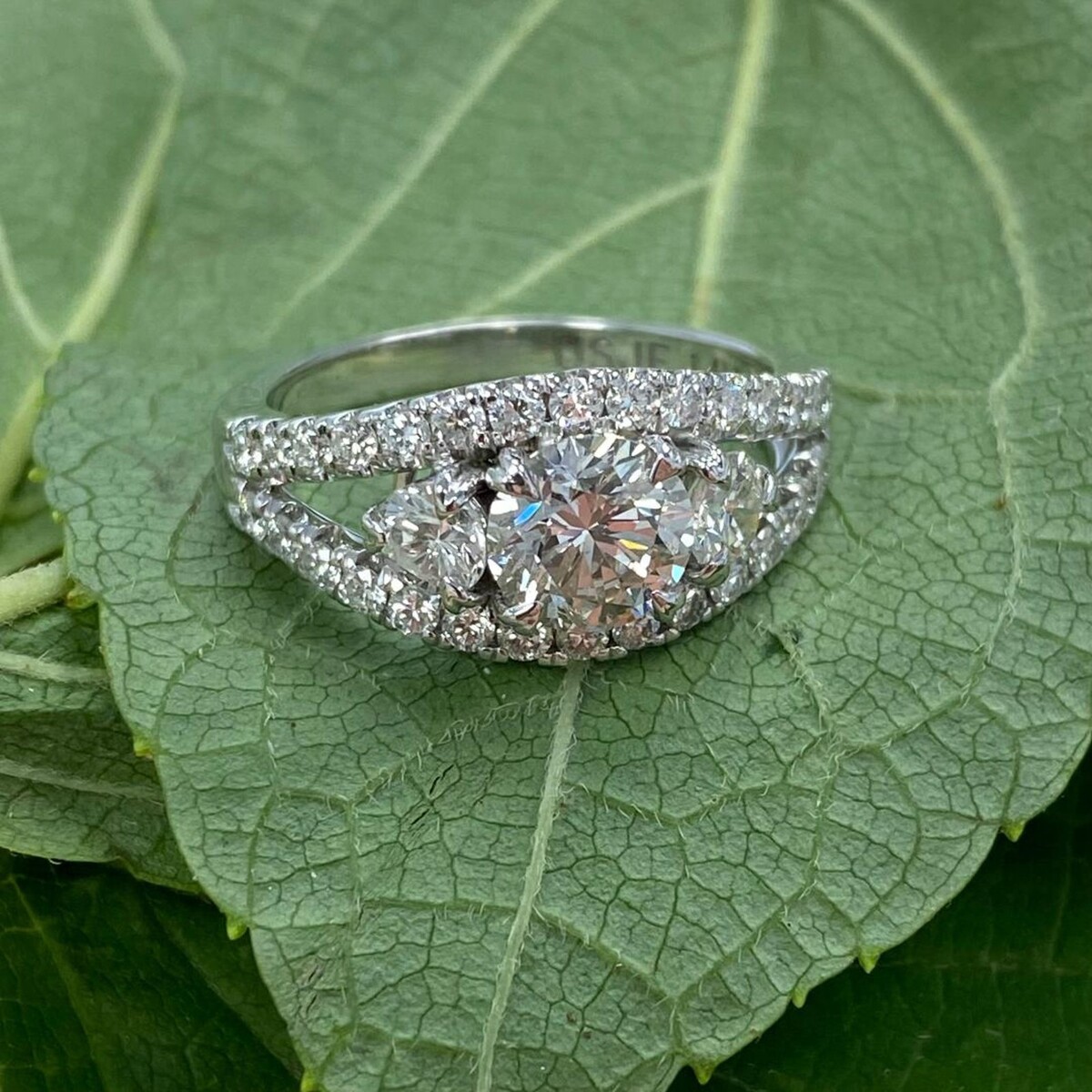 Pasado presente Future anular un símbolo de amor y compromiso de símbolo atemporal. Este sorprendente anillo de compromiso esta cruzado en oro blanco solido de 14k, diseñado para representar el viaje de una pareja juntos a traves de la vida; ¡Los preciados recuerdos del pasado, las alegrías del presente y la promesa del futuro! El elegante anillo de compromiso de diamantes de diseño de tres piedras cuenta con diamantes naturales de corte redondo brillantes en el centro de color marron debil certificado por GIA con un peso de diamante total total de 1.00 quilates con 0.40 quilates 2 diamantes en el lado con 0.70 quilates mas pequeños diamantes de corte brillante redondos en un entorno pavimento y prong. ¡Hecho a mano en oro blanco de 14 quilates y completado con un alto acabado polaco! El peso total de quilates es de 2.10 quilates.
