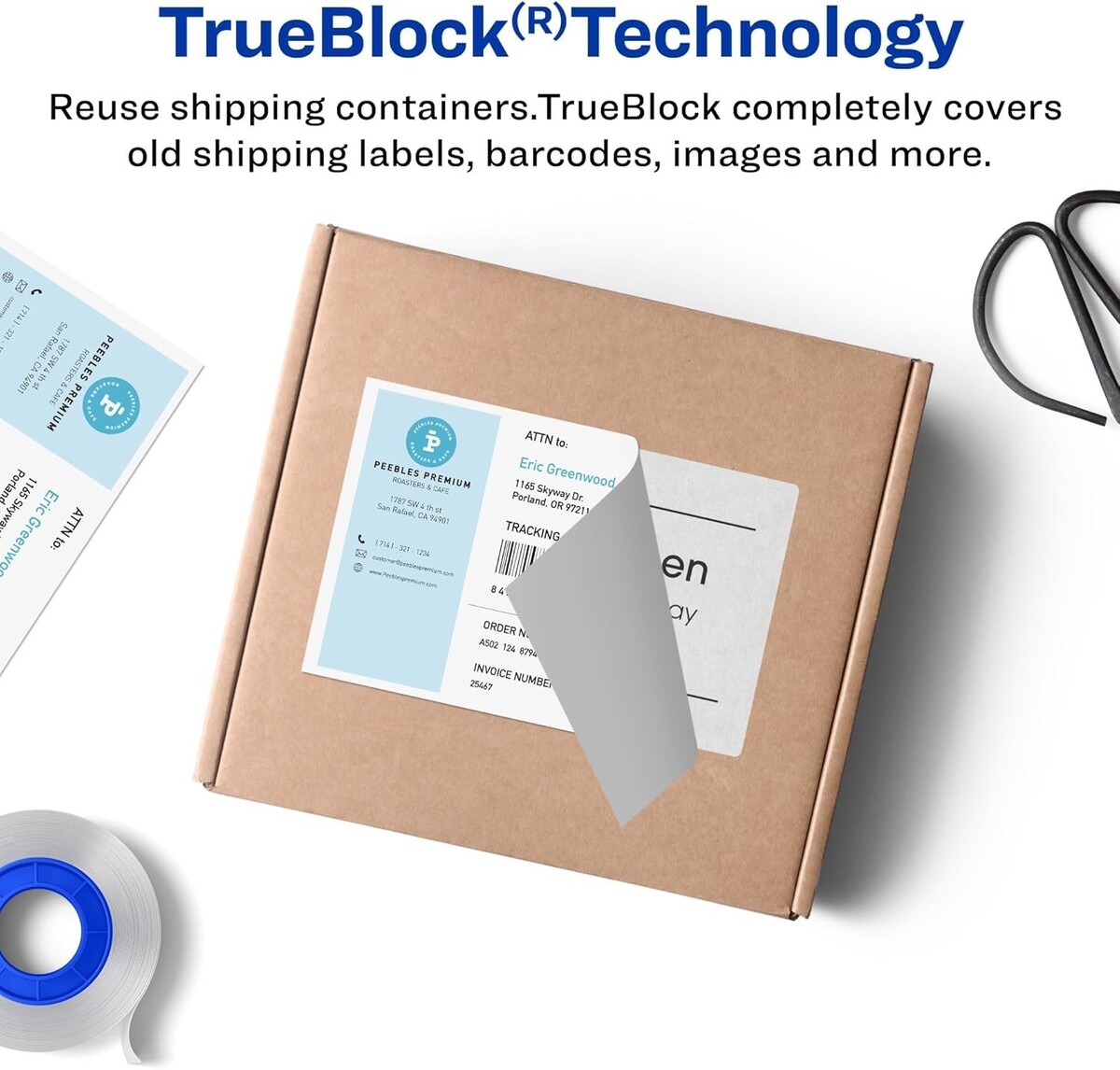 Reuse packaging again and again with our True Block technology that completely covers old shipping labels, markings and everything underneath the label