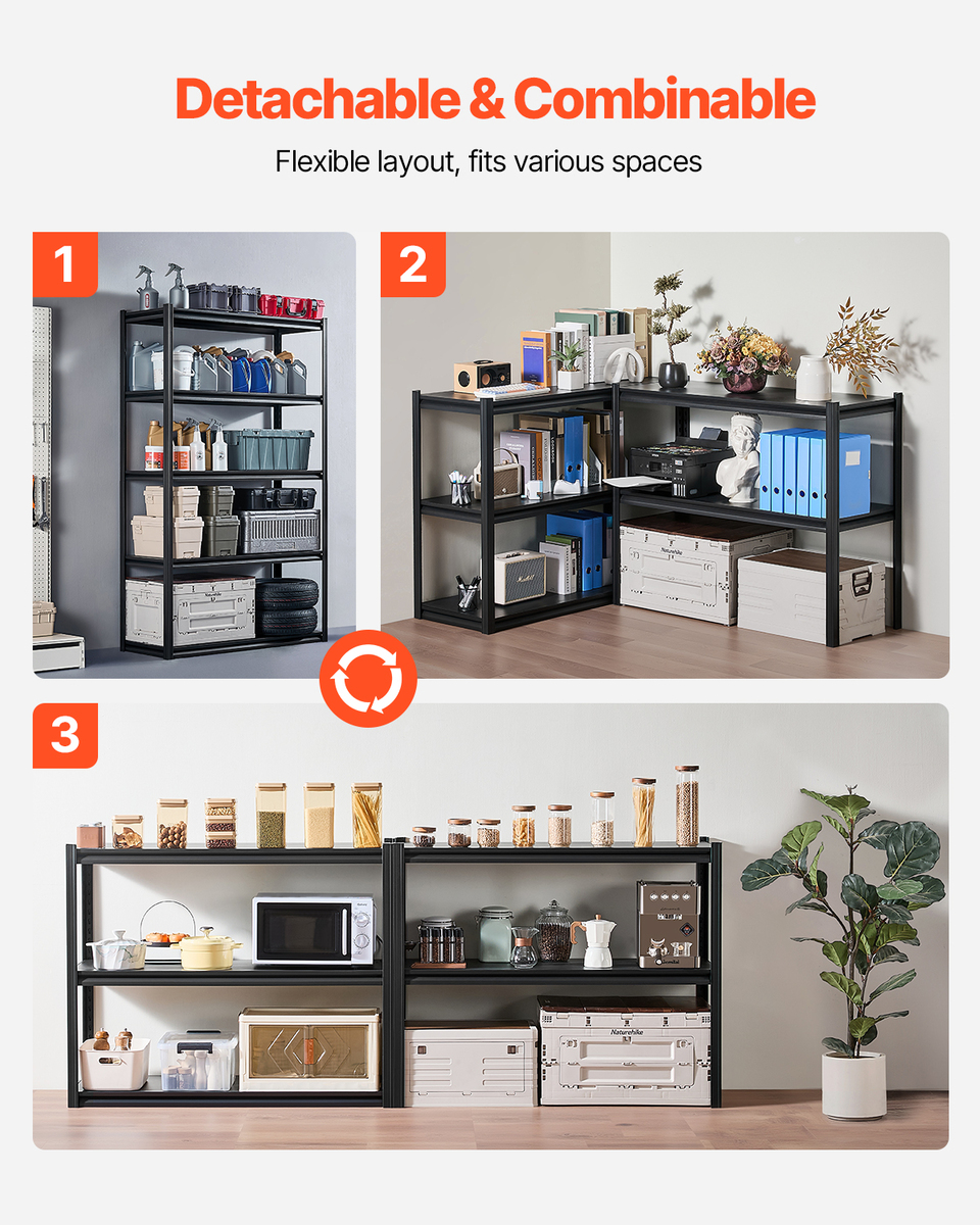 Split Design: This garage shelving unit can be split into two separate racks for flexible use in spaces with height restrictions, such as under stairs, basements, or hallway corners.