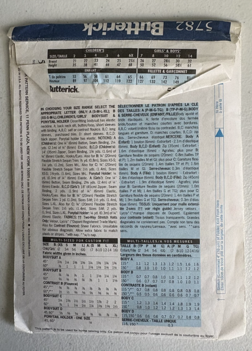 Butterick 5782 Pattern Size A (S, M, L, XL) Vintage 2001 Girls Figure Skating Outfits. This is a new, uncut pattern - UPC #031664284154 - See Photos for further description.