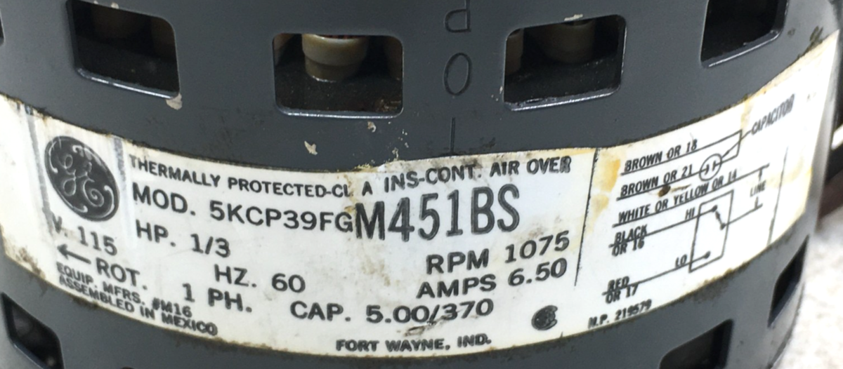 This is GE 5KCP39FGM451BS 1/3HP 1075RPM 115V Blower Motor M16 used part.