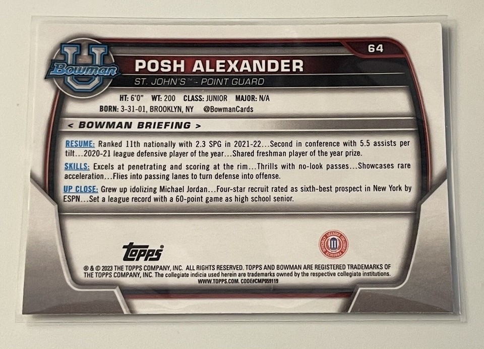 This is the 2022-23 Bowman University Chrome trading card of Posh Alexander, a highly sought-after rookie basketball player currently playing for the St. John's Red Storm and the Butler Bulldogs. The card is made of aluminum and card stock with a thickness of 35 Pt. It features a shimmer parallel and bears the card number 64.