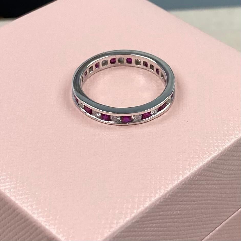 Crafted in 14k white gold, this amazing eternity ring is the perfect choice for those who appreciate sophisticated style and exceptional quality! The 0.58 carat round brilliant colorless diamonds w/ princess cut red ruby are beautifully set in a row, with each diamond expertly cut to maximize its Sparkle and brilliance.
