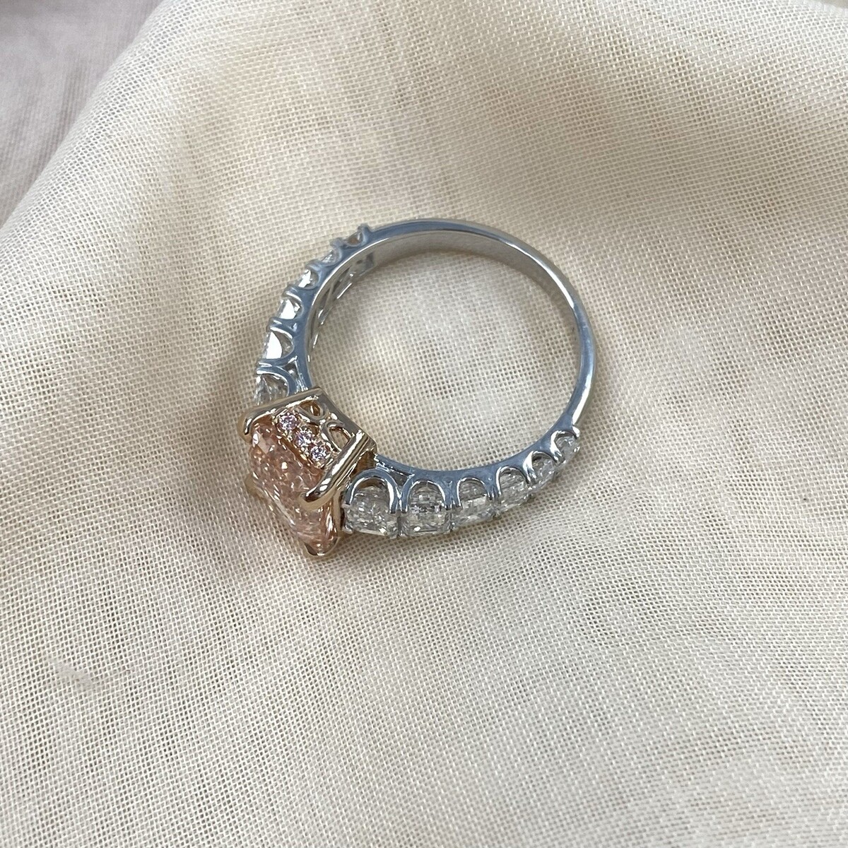 Dieser exquisite Diamant-Verlobungsring verfügt über einen atemberaubenden, im Labor gezüchteten, intensiv rosafarbenen Diamanten im Smaragdschliff von 3,09 Karat, der elegant von einem im Labor gezüchteten, farblosen Diamanten im Smaragdschliff umgeben ist. Die aufwendige Fassung ist aus 14-karatigem Weiß- und Rosegold gefertigt. Entlang des Bandes liegen Diamanten in Mikropave-Fassung, die für einen eleganten Ewigkeitslook sorgen. Dieses großartige Stück strahlt Brillanz und Raffinesse aus und macht es zum perfekten Symbol für ewige Liebe. Das Gesamtkaratgewicht betragt 6,22 Karat.