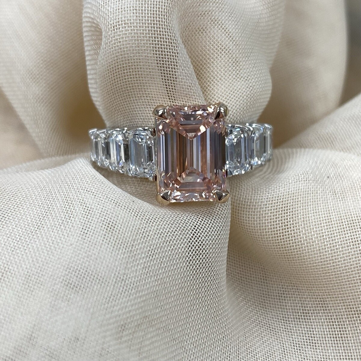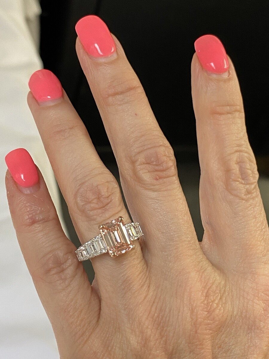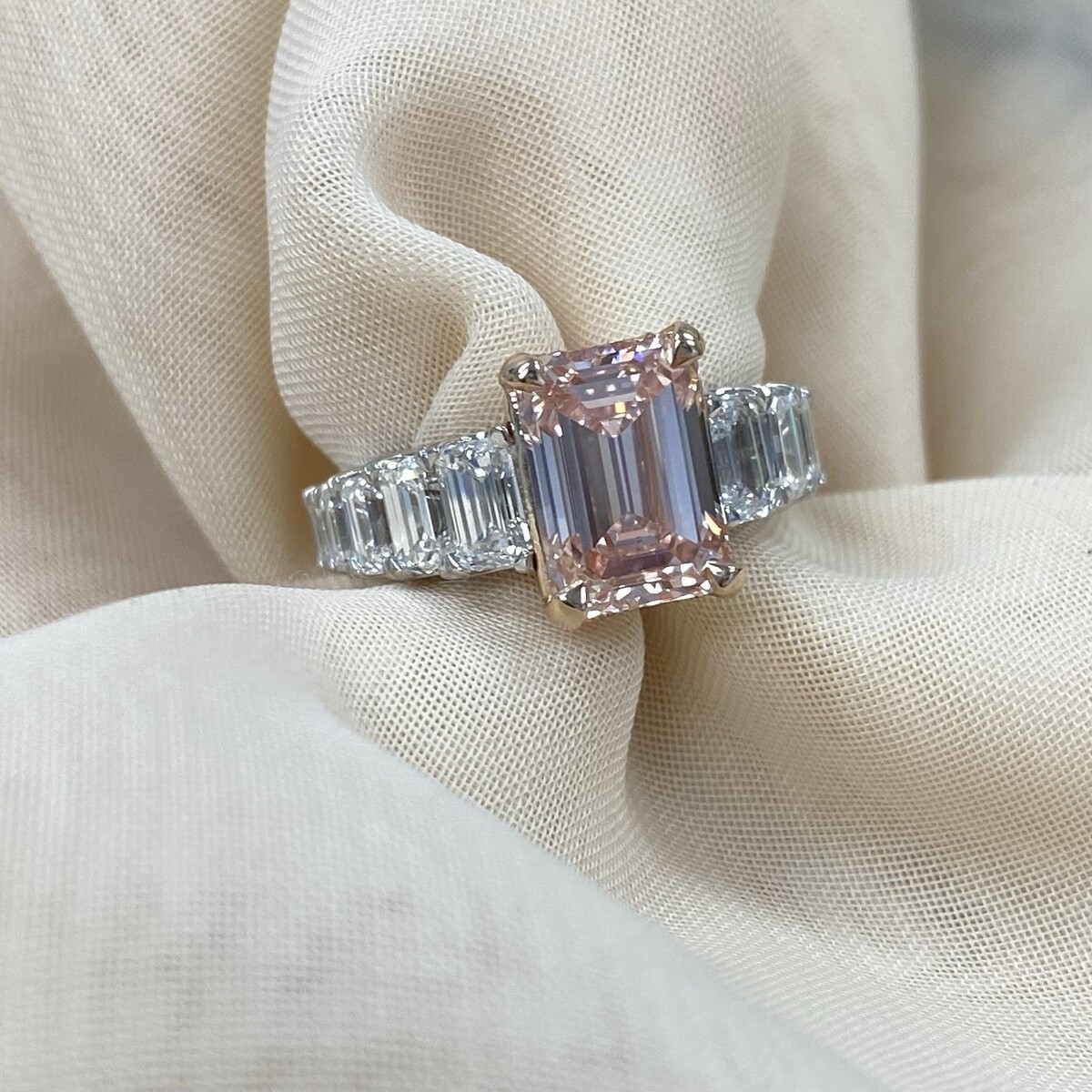 Dieser exquisite Diamant-Verlobungsring verfügt über einen atemberaubenden, im Labor gezüchteten, intensiv rosafarbenen Diamanten im Smaragdschliff von 3,09 Karat, der elegant von einem im Labor gezüchteten, farblosen Diamanten im Smaragdschliff umgeben ist. Die aufwendige Fassung ist aus 14-karatigem Weiß- und Rosegold gefertigt. Entlang des Bandes liegen Diamanten in Mikropave-Fassung, die für einen eleganten Ewigkeitslook sorgen. Dieses großartige Stück strahlt Brillanz und Raffinesse aus und macht es zum perfekten Symbol für ewige Liebe. Das Gesamtkaratgewicht betragt 6,22 Karat. Unsere Produkte sind alle von Qualitat und Pflege im Herzen des Diamond District in der 47th Street in New York City hergestellt. Unser Engagement und unser Engagement für eine gute Arbeit und Qualitat überste