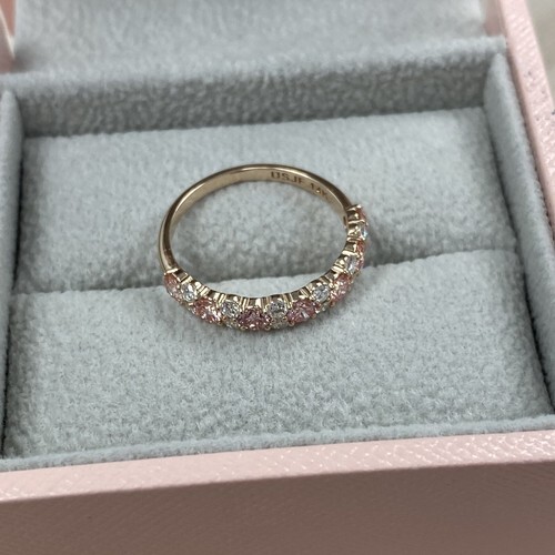 Esta impresionante alianza presenta un elegante diseño alterno, con diamantes rosados ??cultivados en laboratorio de talla redonda en engarce en puntas, cada uno seguido de dos brillantes diamantes blancos cultivados en laboratorio. Elaborada en un lujoso engaste de oro de 14 quilates, esta alianza ofrece un contraste vibrante y una sofisticacion atemporal, lo que la convierte en la opcion perfecta para un anillo de boda o aniversario. El peso total en quilates es de 1 quilate.
