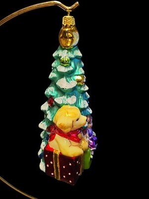 Christopher Radko glass Christmas ornament from the 2018 OHSU Doernbecher collection. Handcrafted blown glass featuring a Christmas tree with children, toys, and gifts. Part of a special edition series designed by young patients at OHSU Doernbecher Children?s Hospital.