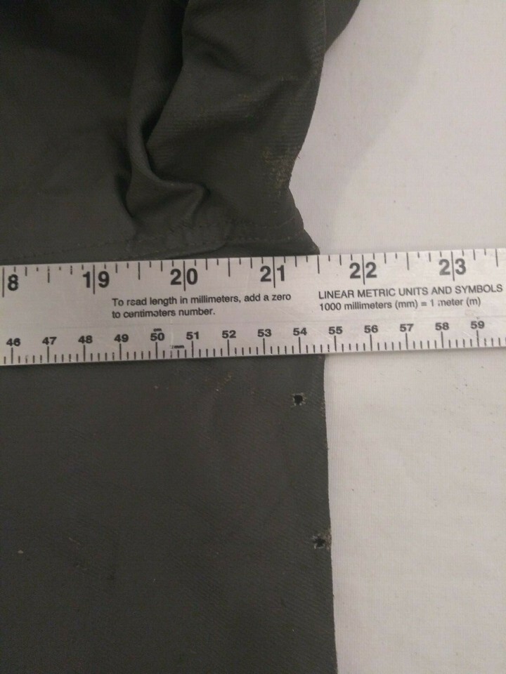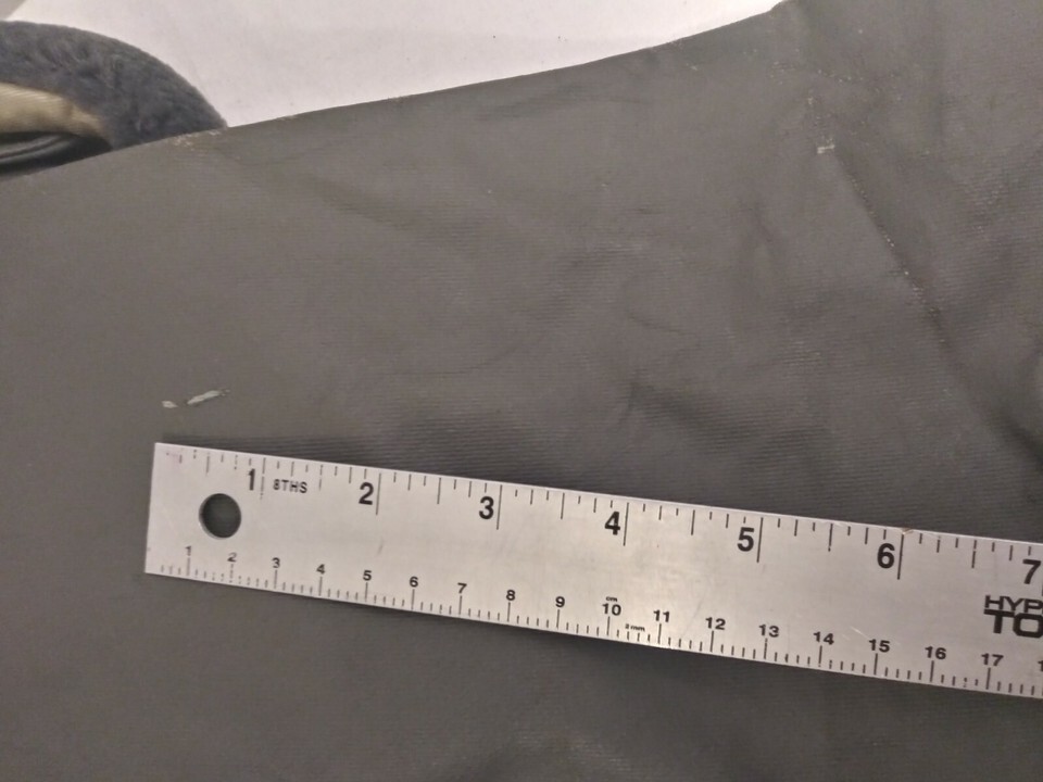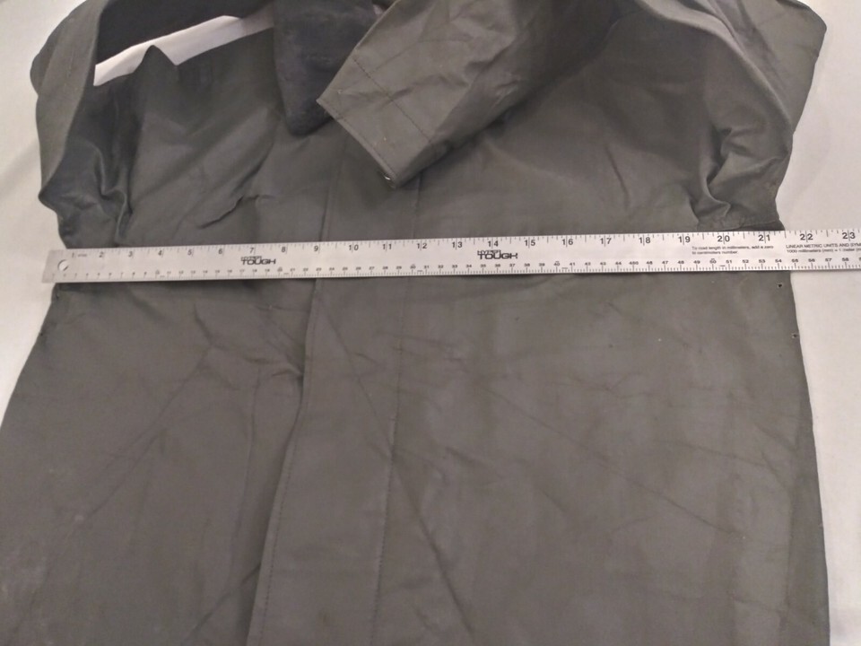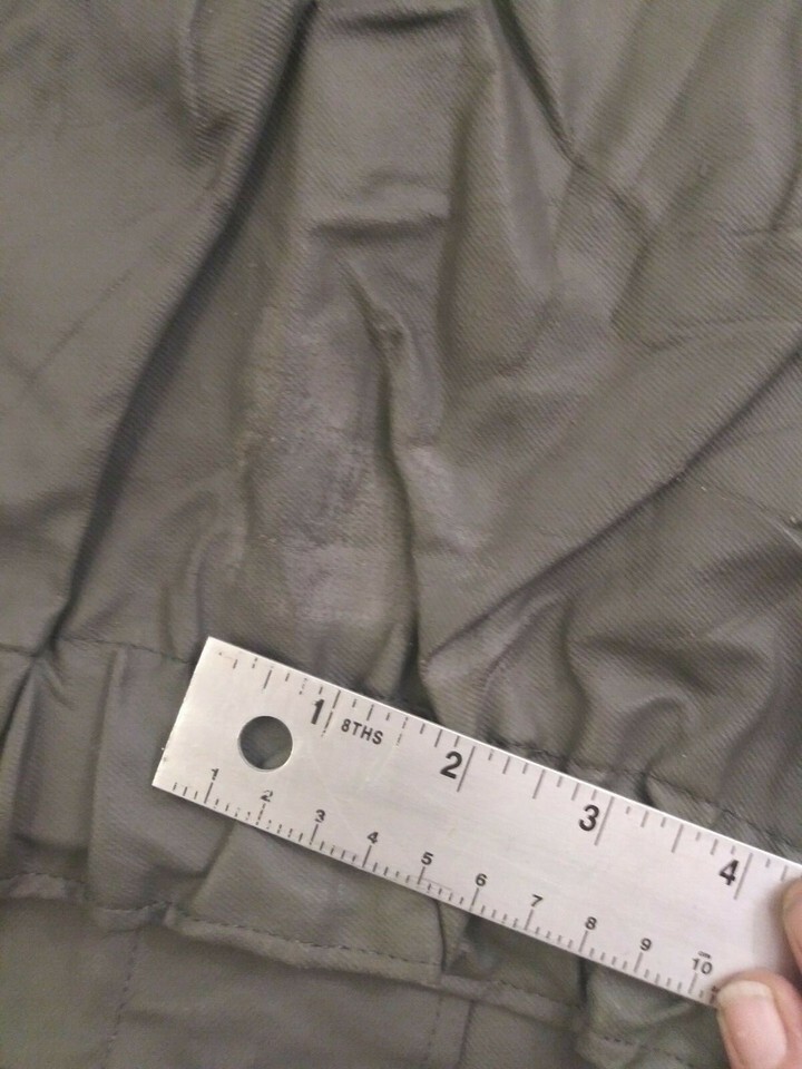 DEFECTS: THE PU COATING IS WEARING OFF IN A SPOT BOTTOM CENTER BACK ABOVE HEM LINE, ALSO SOME SCRATCHES ON BACK AND ARMS, LOOKS LIKE POSSIBLE GREEN PAINT IN FRONT FLAP OVER ZIPPER~PLEASE SEE PHOTOS