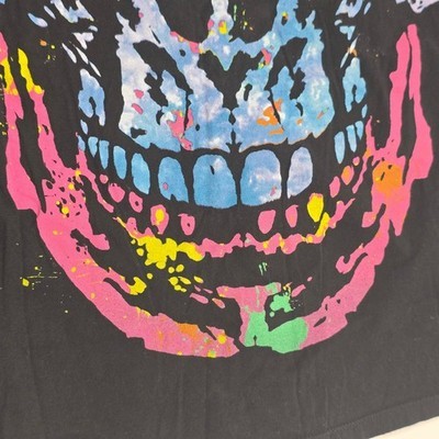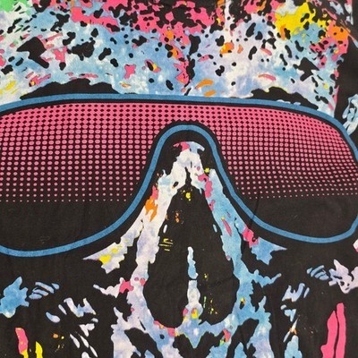 Keywords: skull, sunglasses, graphic tee, streetwear, bold print, summer shirt, casual wear, neon colors, abstract art, skull graphic, funky tee