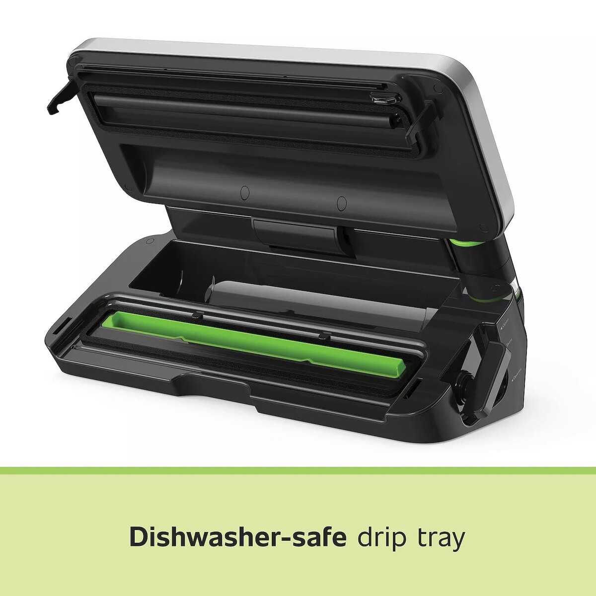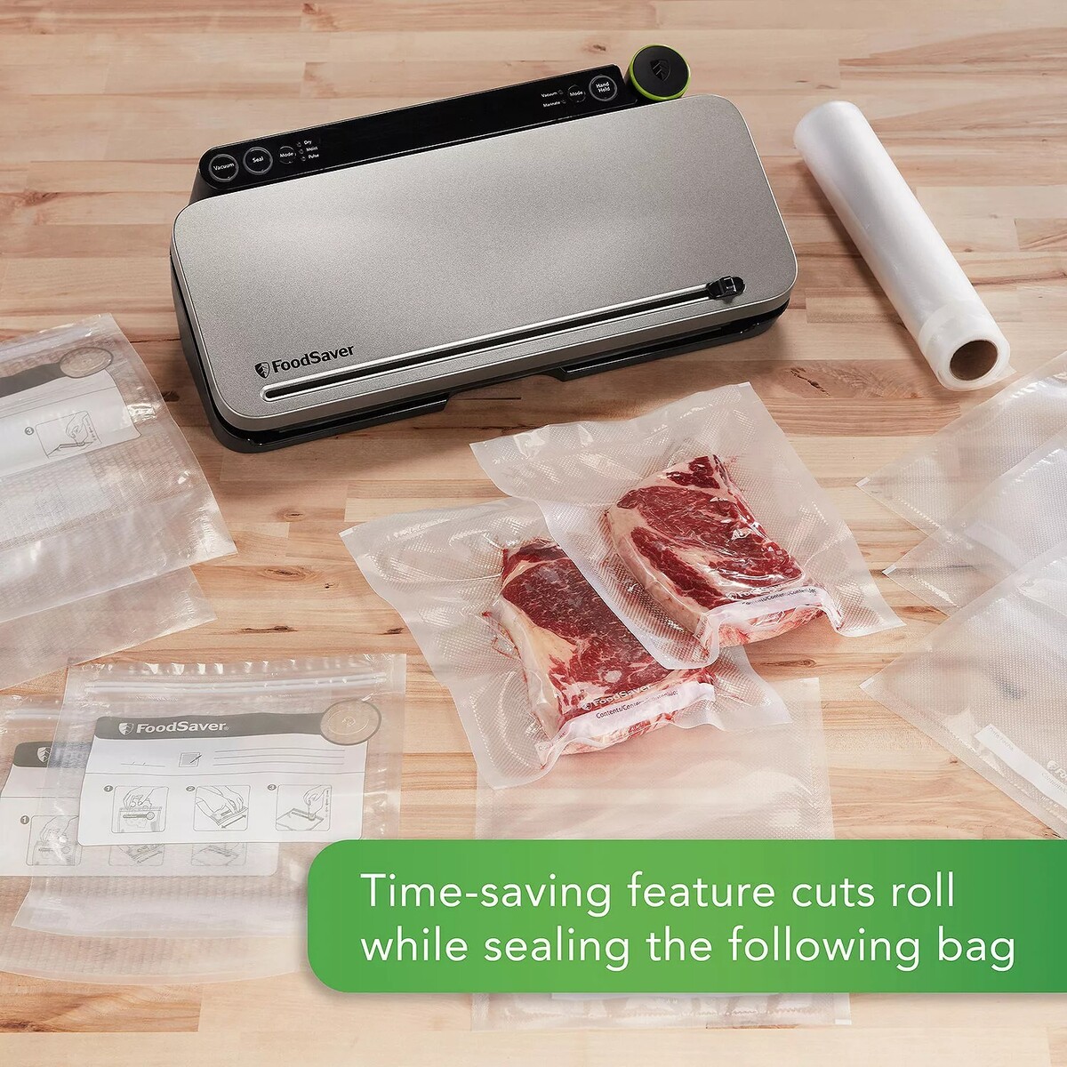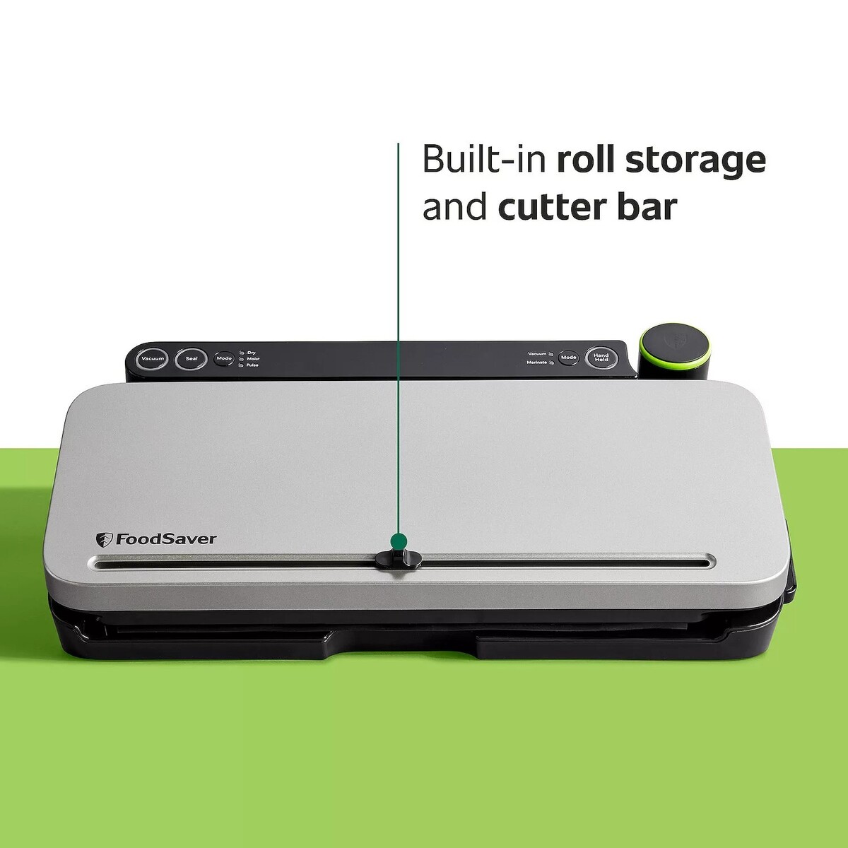 Roll storage with built-in cutter bar so you can create custom-sized vacuum seal bags