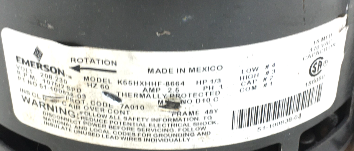 This is EMERSON K55HXHHF-8664 Blower Motor 51-100838-03 1/3HP 208/230V 1075 RPM/2 SPD used part, comes with a brand new capacitor.