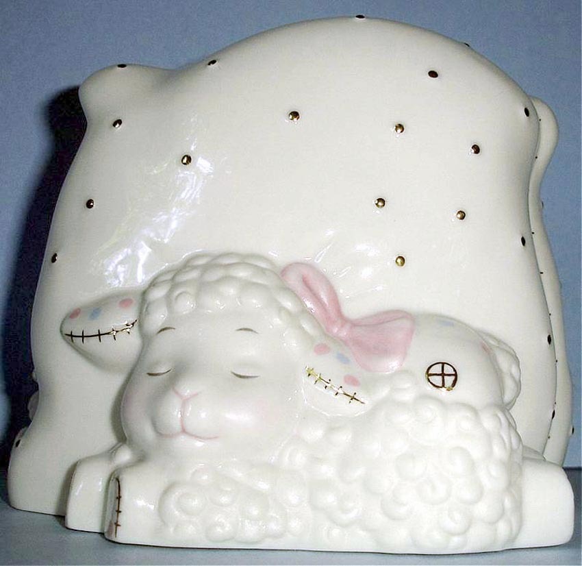 One side features a sleeping lamb with a pink bow and