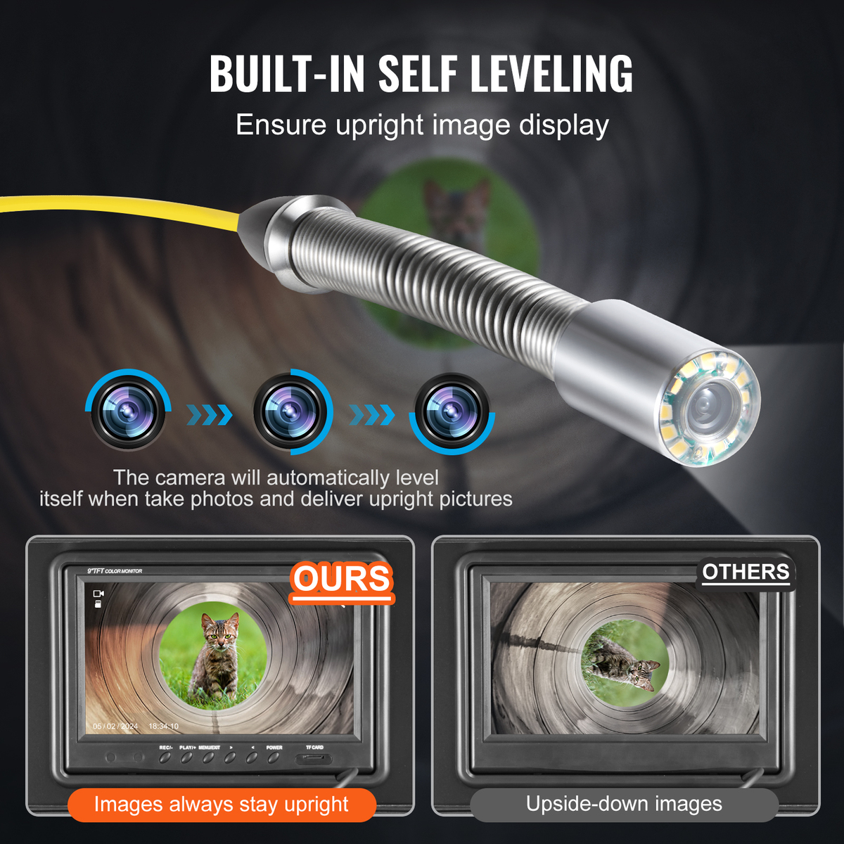 Self-Leveling Camera: Our 0.9-inch self-leveling pipe camera ensures images are always upright, giving you accurate orientation of obstacles for efficient inspections. Itโs equipped with an IP68 waterproof sapphire lens and 12 adjustable LED lights with stepless brightness adjustment to suit different lighting conditions. The 36x digital zoom and 145 wide-angle view capture every detail, ensuring nothing gets missed.