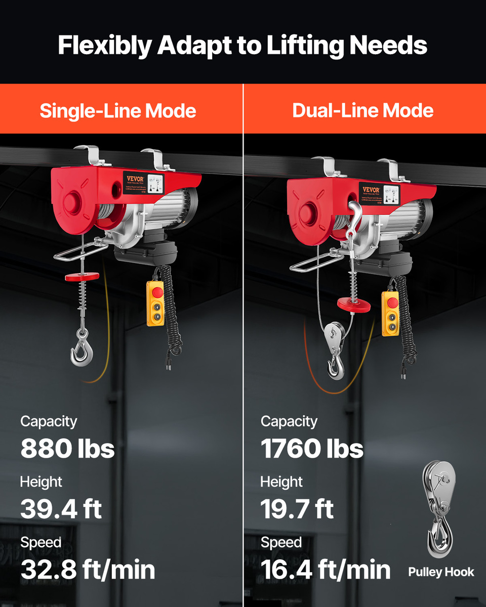 1760 lbs Load Capacity: This garage lifting machine can easily lift small engines, transmissions, large workshop tools, or construction supplies. Capacity: 880 lbs (Single Line), 1760 lbs (Double Lines).