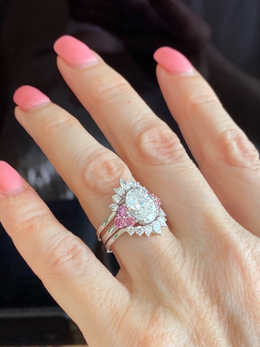 Questo elegante set da sposa in oro bianco 14k mette in mostra uno splendido diamante coltivato in laboratorio a taglio ovale da 2,04 carati, certificato IGI per qualita e brillantezza, come elemento centrale dell'anello di fidanzamento. La pietra centrale e splendidamente completata da tre vivaci diamanti rosa coltivati ??in laboratorio su ciascun lato, aggiungendo un vivace tocco di colore.