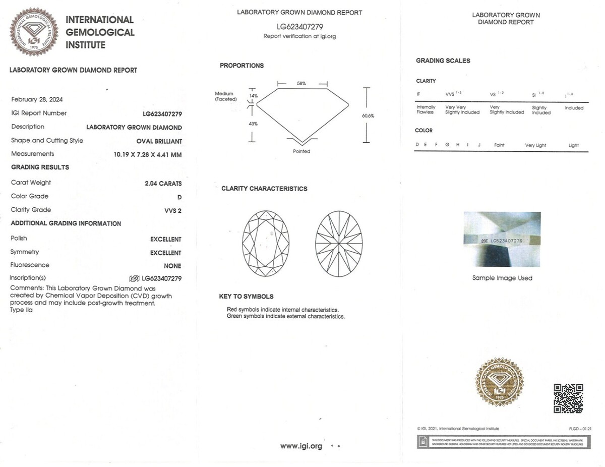 Igi 2.04Ct D-VVS2 Laboratorio Crecido Ovalado Anillo de Compromiso Diamante 14k
