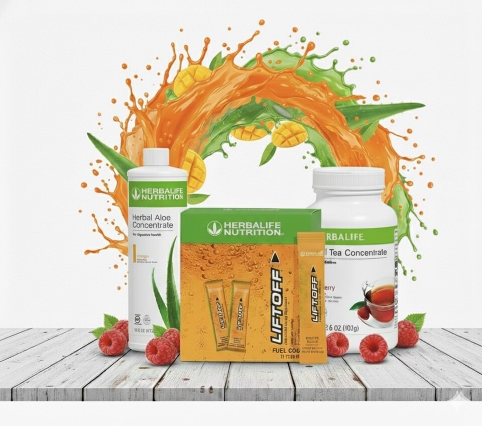 Feel refreshed and focused every day with this energizing Herbalife trio! Featuring Raspberry Herbal Tea Concentrate, Mango Aloe Concentrate, and 30 Liftoff Ignite-Me Orange Energy Sticks, this set combines tropical taste, clean energy, and digestive support ? perfect for busy mornings or active lifestyles.