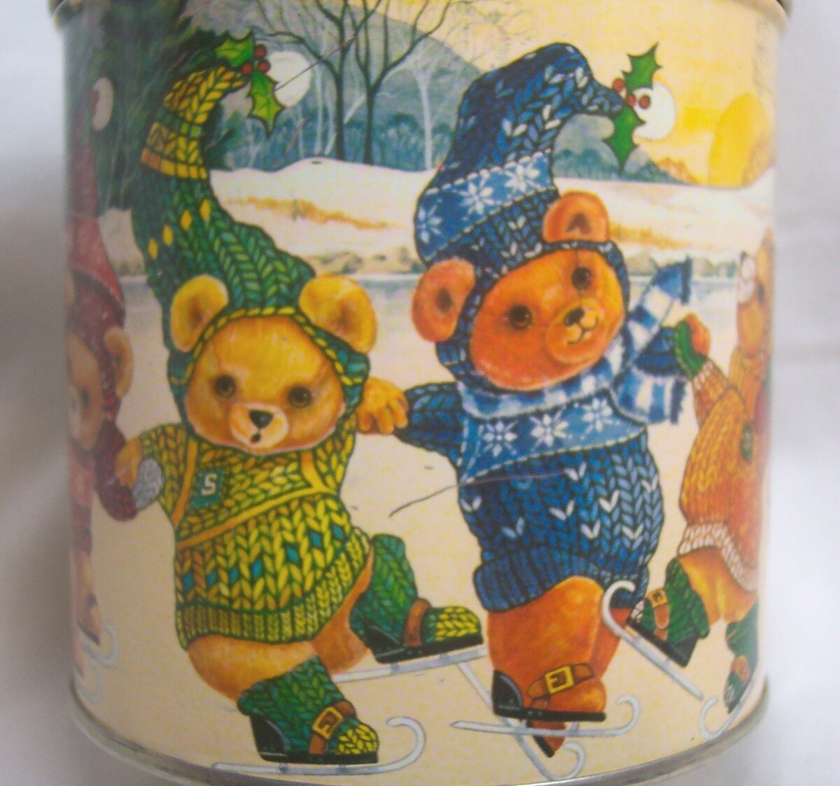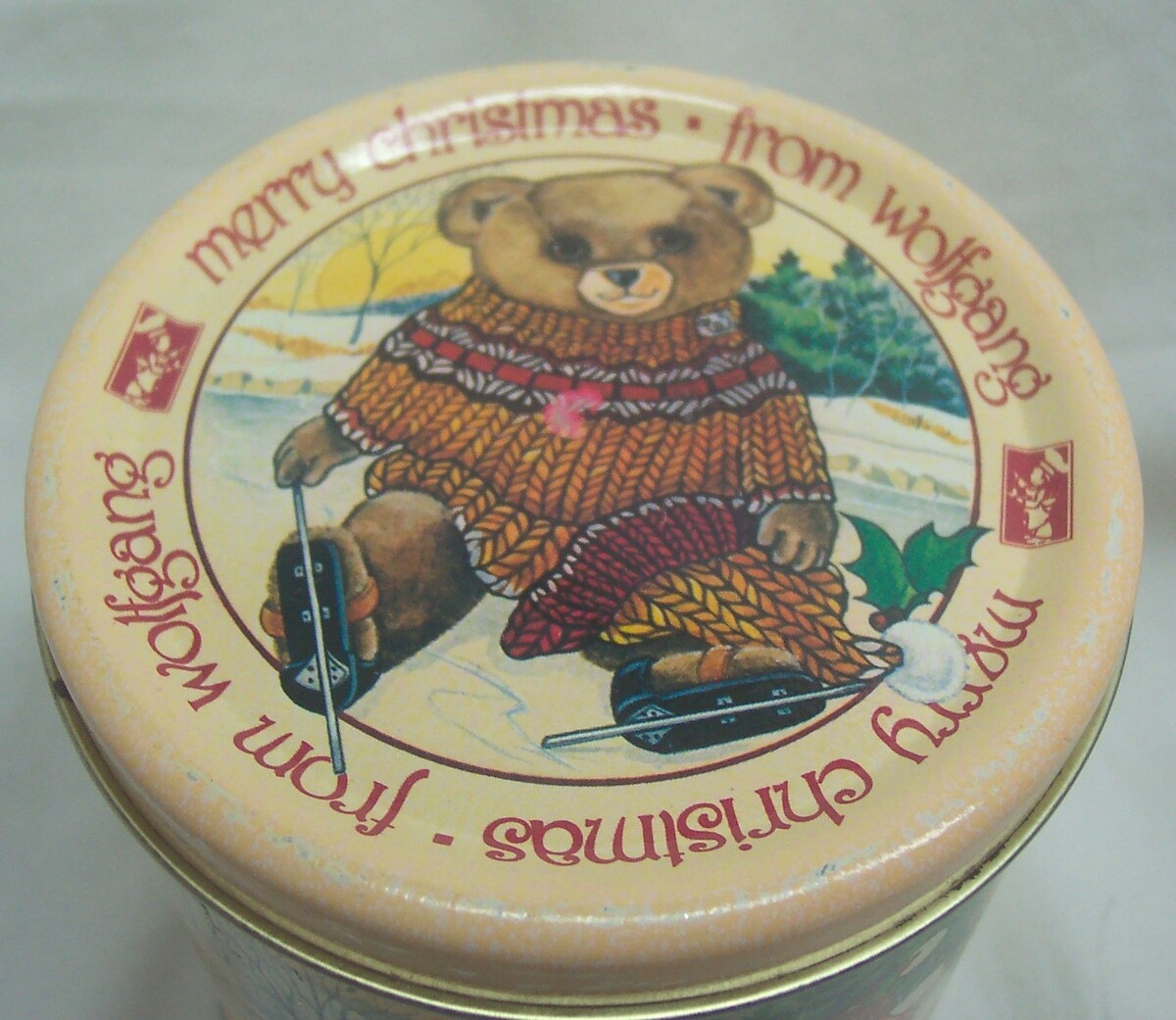 VINTAGE "Merry Christmas from Wolfgang" ICE SKATING BEARS 4" TIN CANISTER 1980's