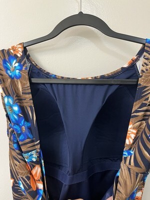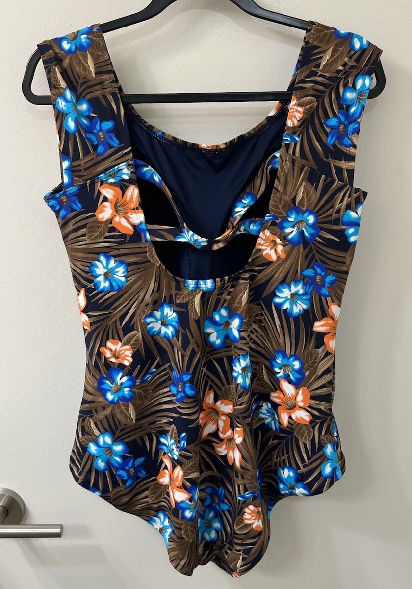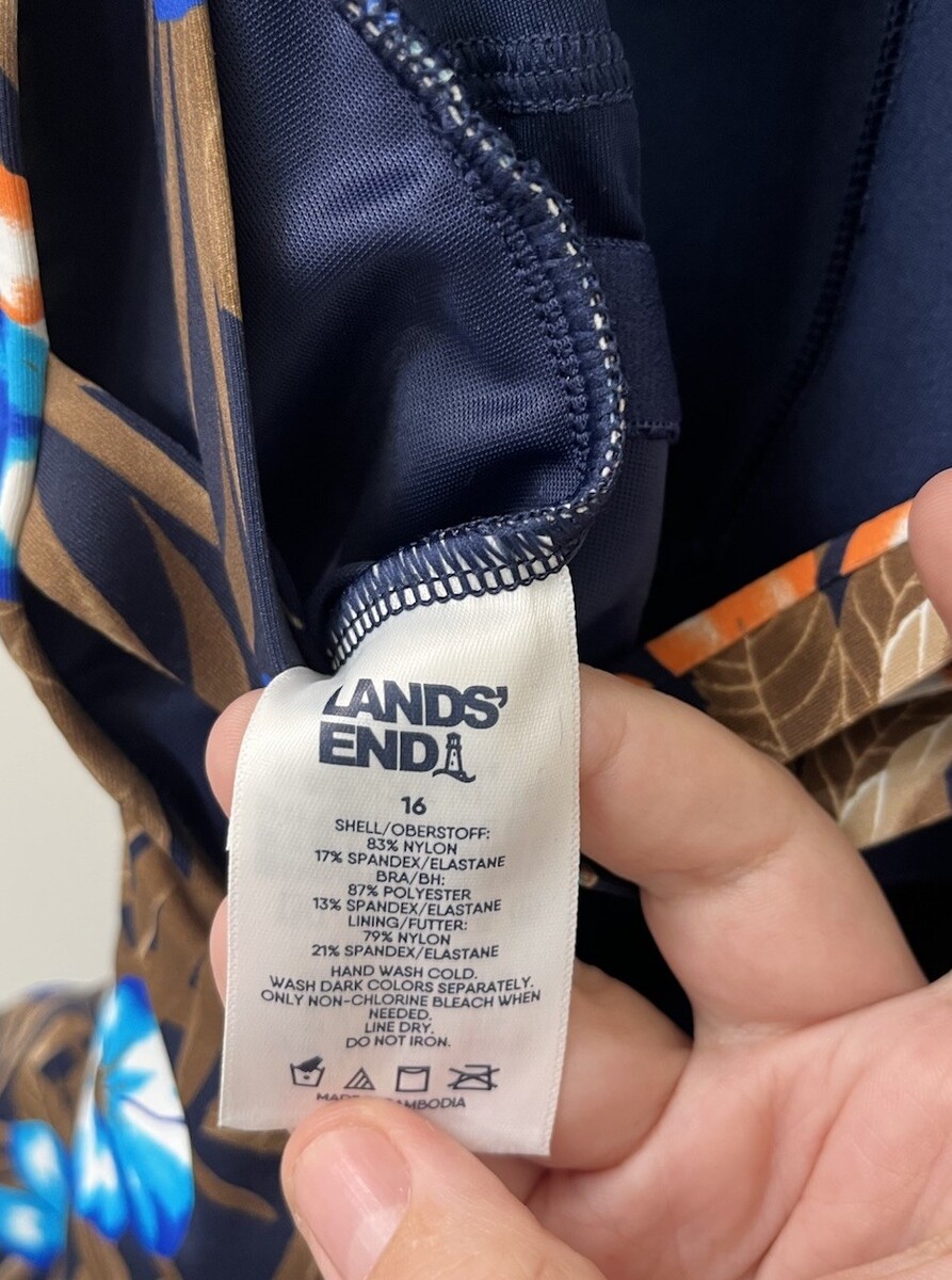 This Lands' End swimsuit in size 16 is a one-piece bathing suit featuring a vibrant floral pattern in tropical blue, orange, and brown colors. It offers a stretchy material for a comfortable fit, making it perfect for beach days, poolside lounging, or other summer activities. The classic and colorful design adds a fun and stylish touch to your poolside or beach look. There is no underwire. Please let me know if you have any questions!