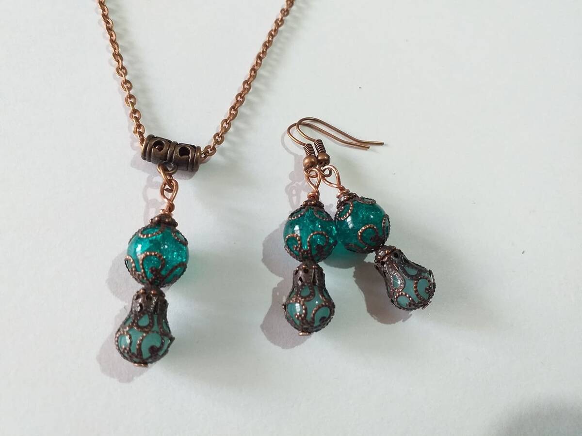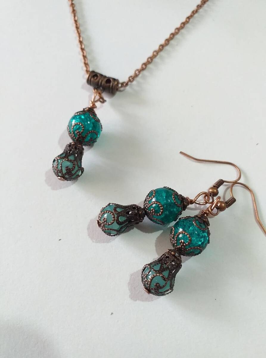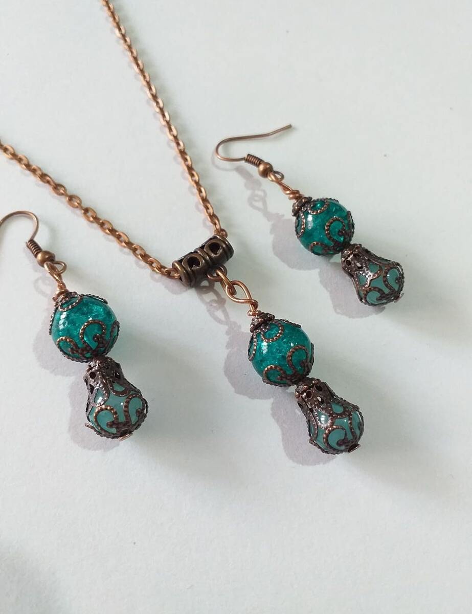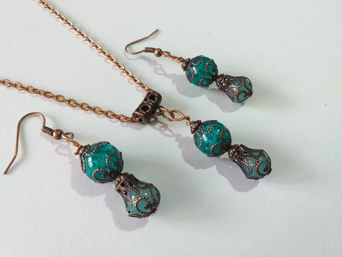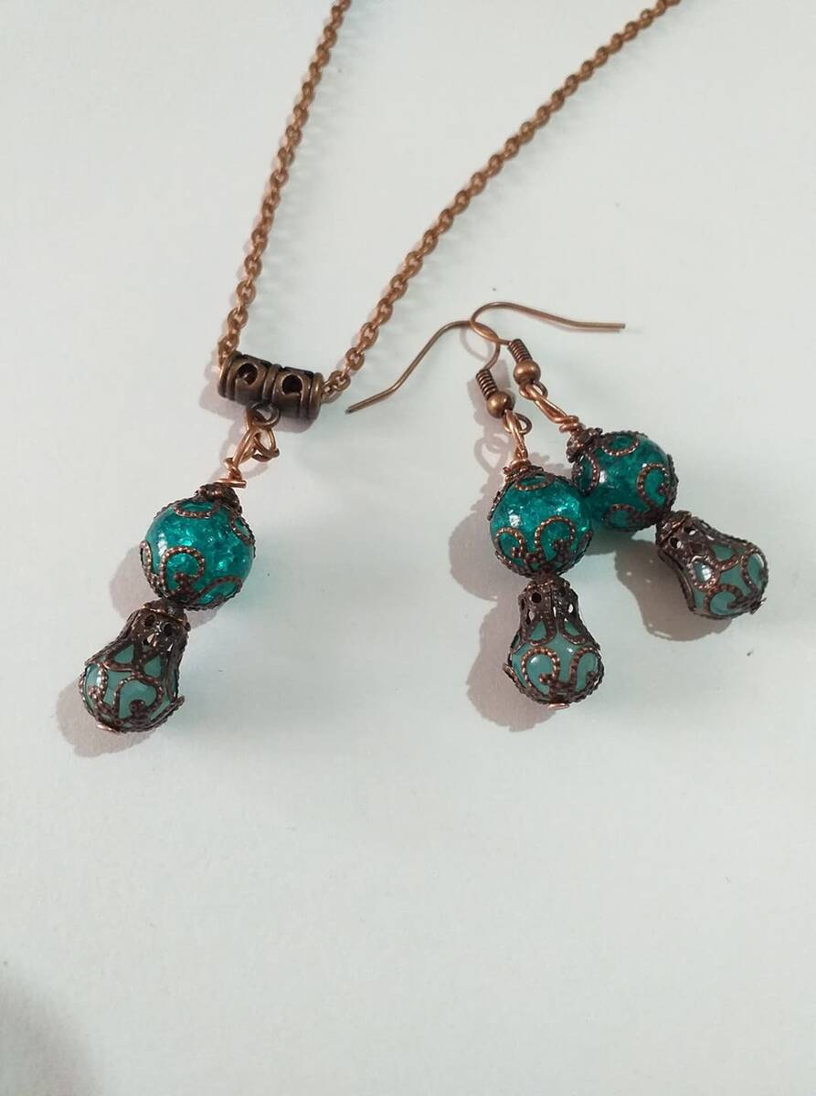 Beautiful Set copper Victorian Antique style blue-green toned crackle glass beads necklace and earrings . Beautiful pendant necklace and earrings . Boho necklace . Bohemian necklace and earrings . Victorian necklace and earrings .