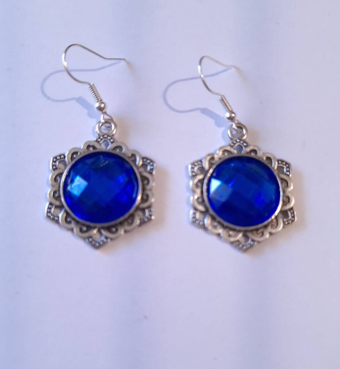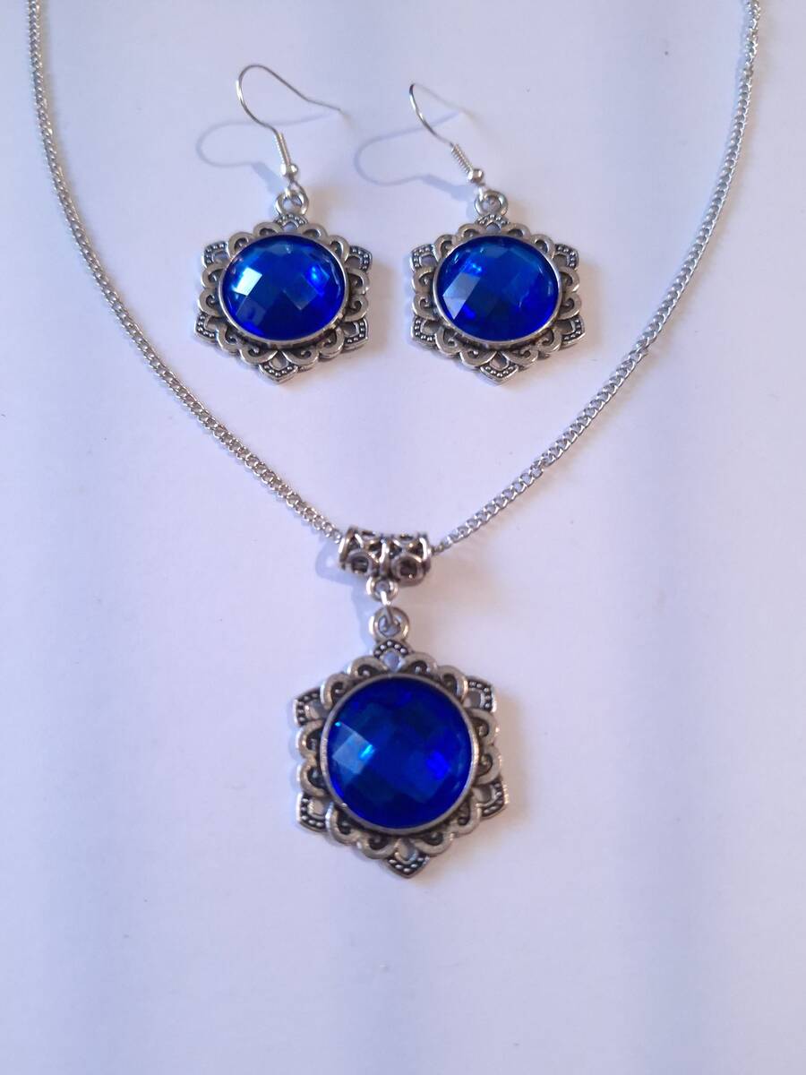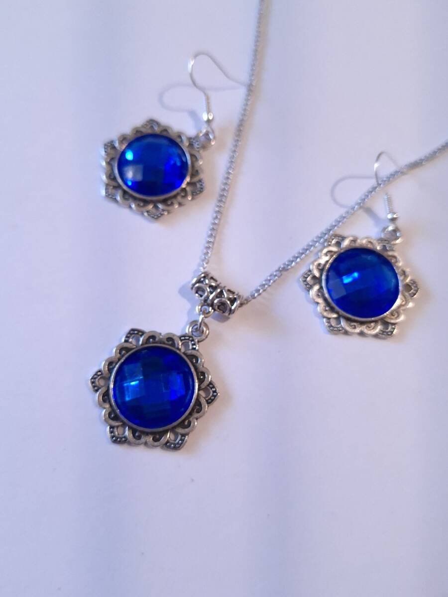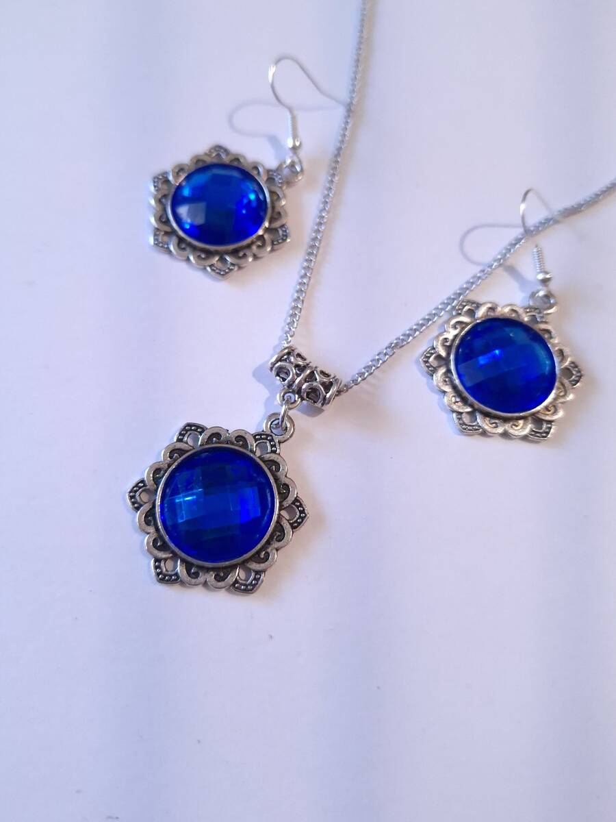 Silver Royal blue Victorian set necklace earrings . Bohemian necklace and earrings .