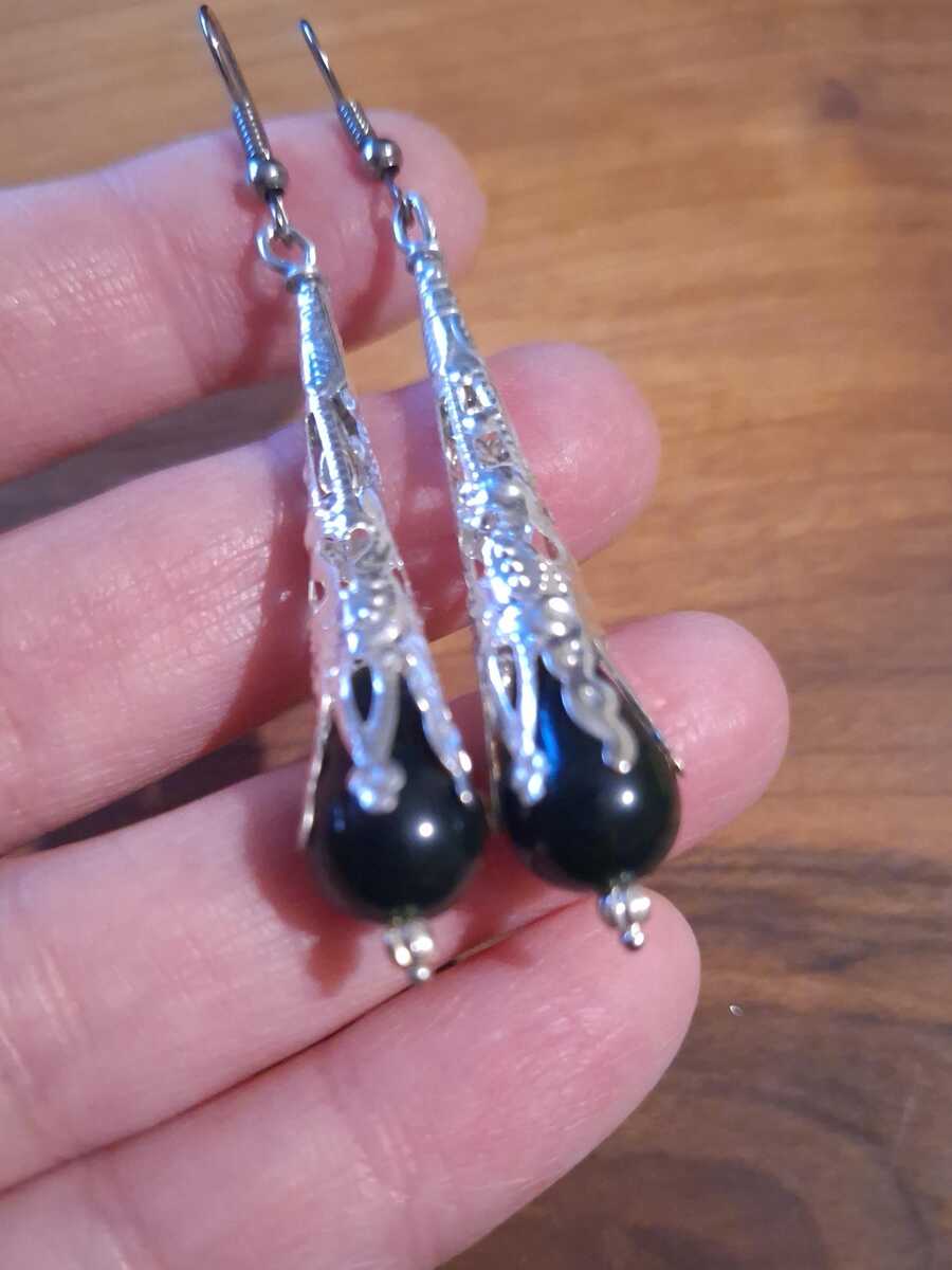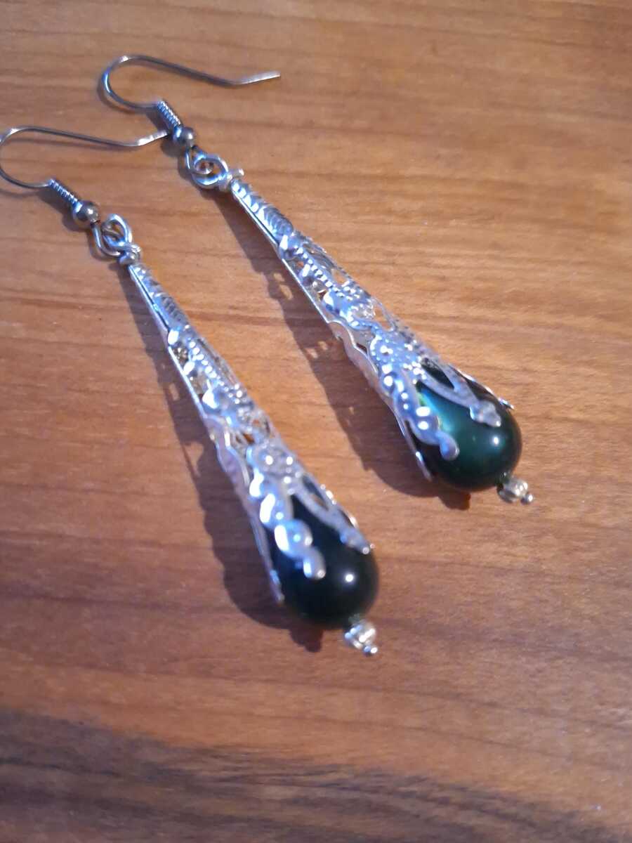 Victorian very dark green acrylic teardrop shaped beads and Silver-toned filigree ornaments earrings . Silver-toned beautiful earrings Special occasion earrings . Gothic almost black green teardrop acrylic beads earrings.