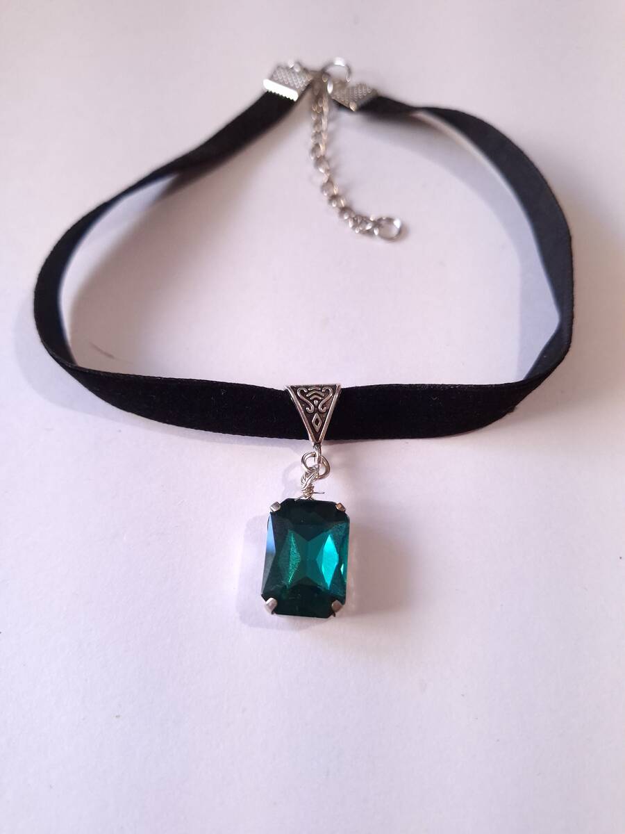 Beautiful silver-tone Antique style ornaments and Emerald green large glass faceted crystal on black velvet choker necklace . Silver tone green pendant Victorian style necklace . Boho necklace. Bohemian necklace . Romantic necklace. Beautiful necklace with emerald green pendant.