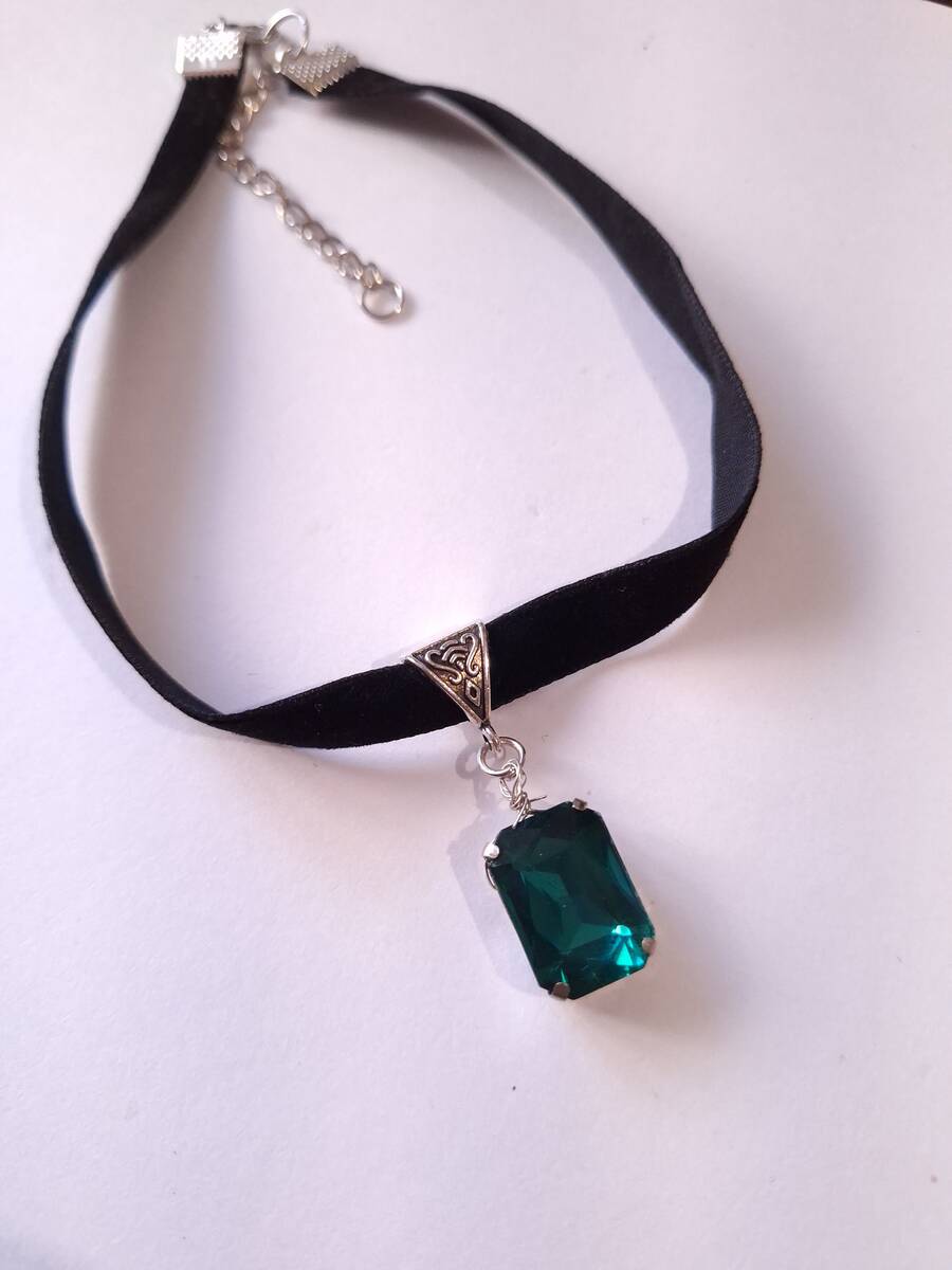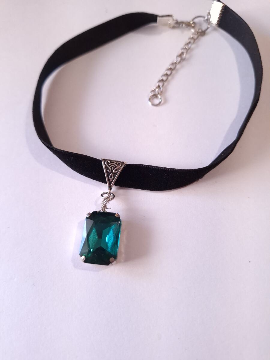 Material: silver toned metal ornament, emerald green large glass faceted cabochon, black velvet- 1 cm.