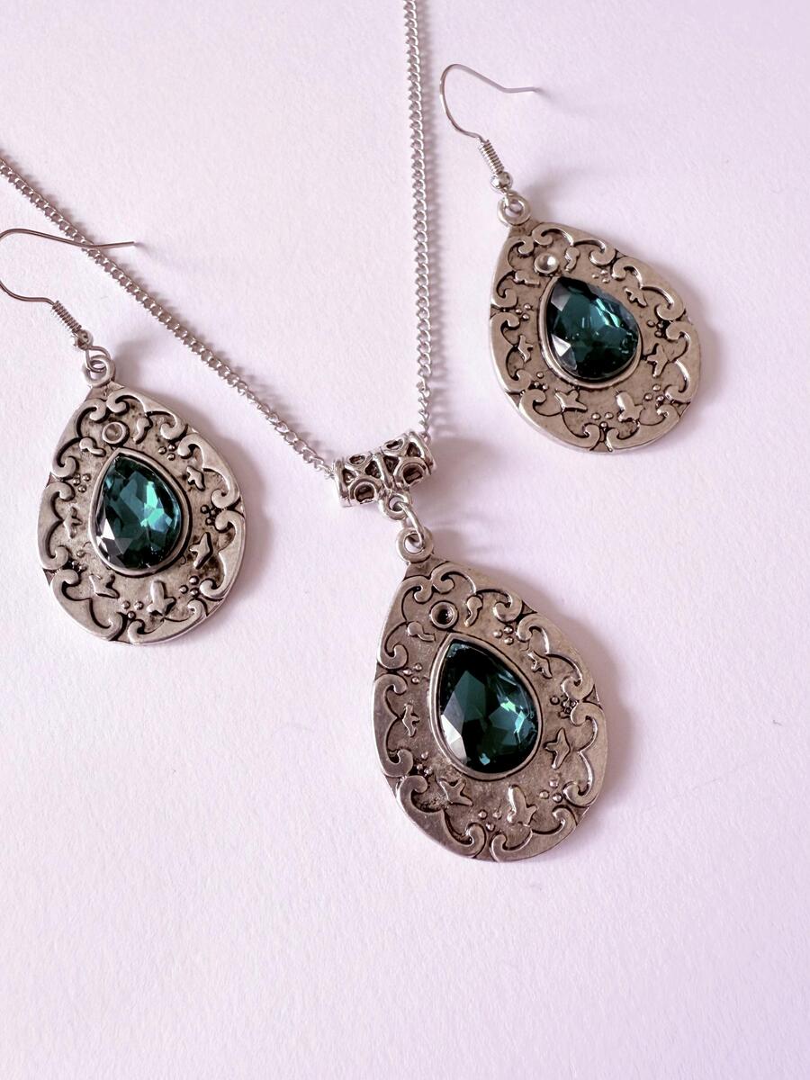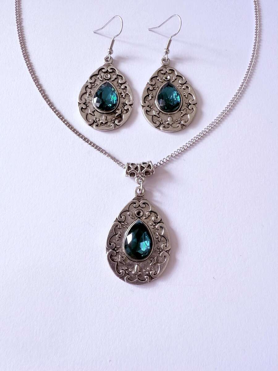 Beautiful Set of silver-tone Antique style beads dark emerald green necklace and earrings. Silver tone pendant Victorian style necklace and earrings. Boho necklace. Bohemian necklace and earrings. Romantic necklace and earrings.