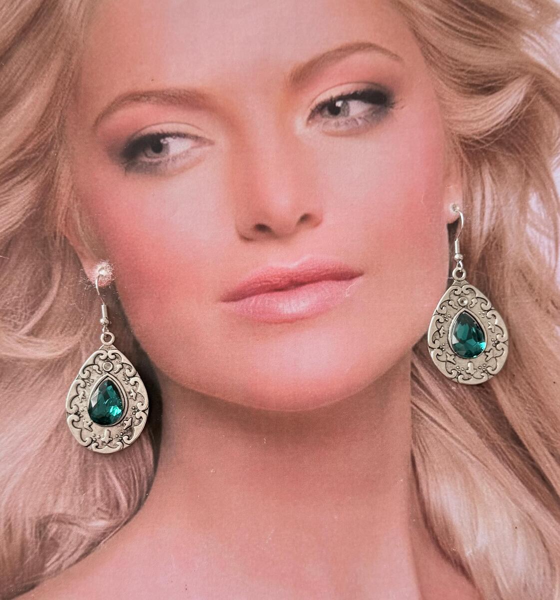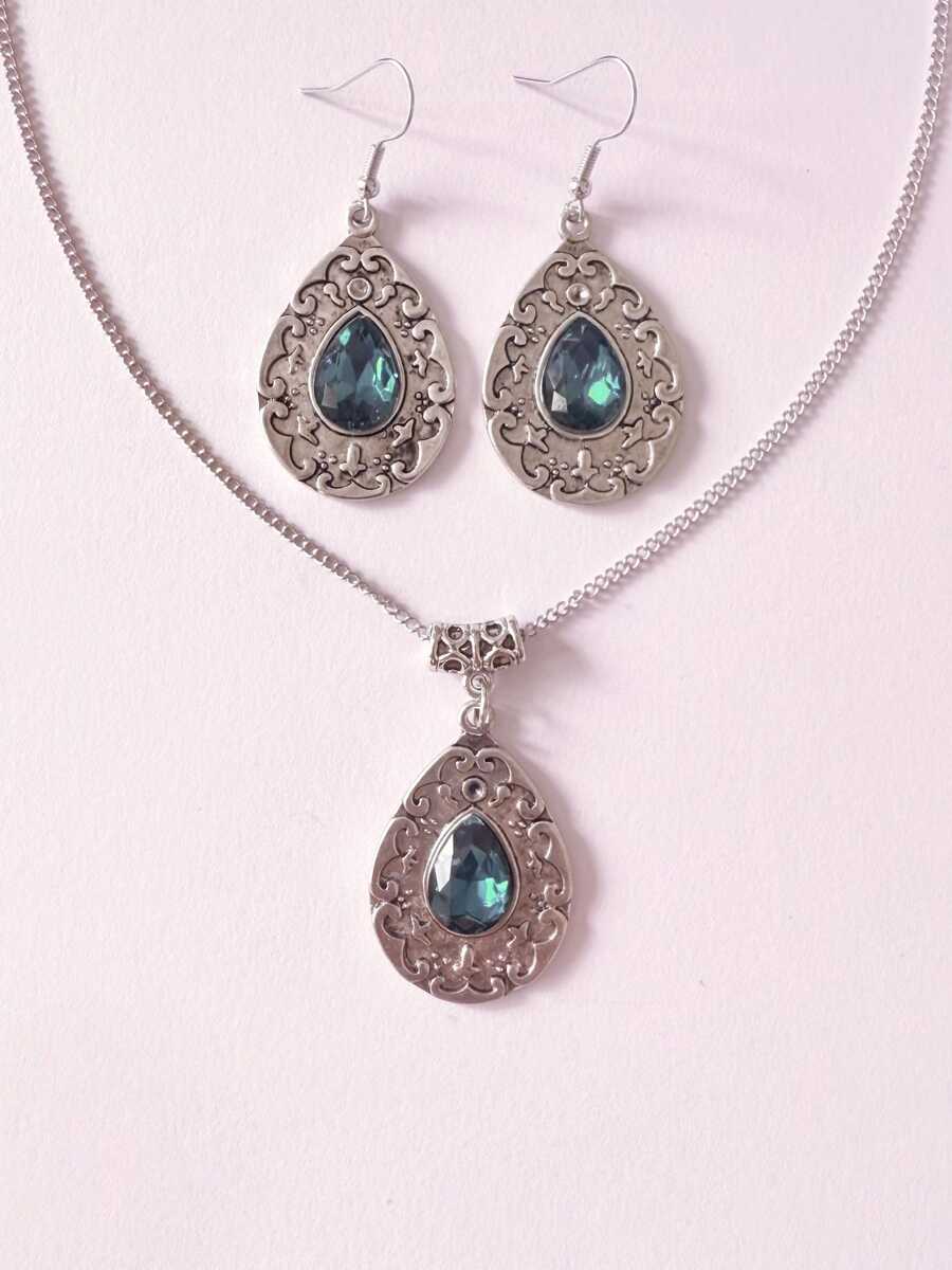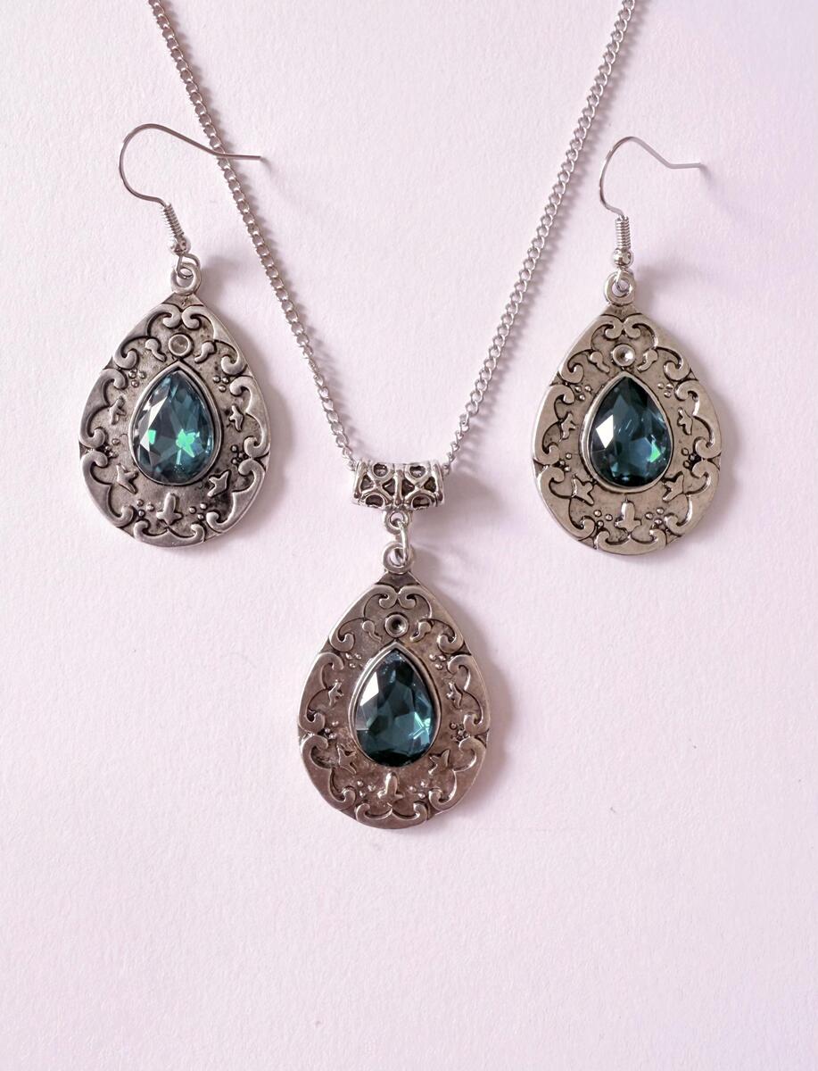Silver Emerald green Victorian set necklace earrings . Bohemian necklace and earrings .
