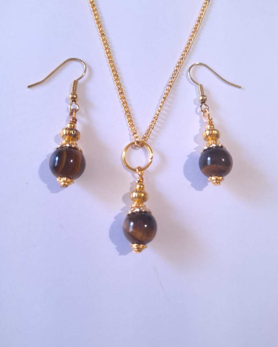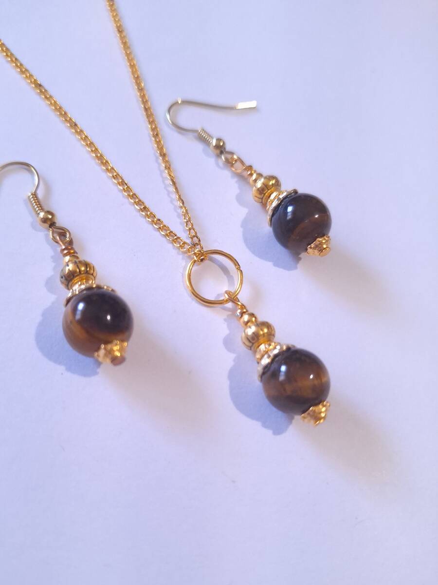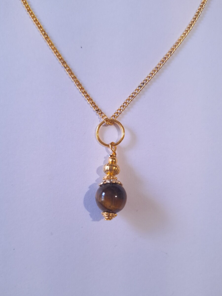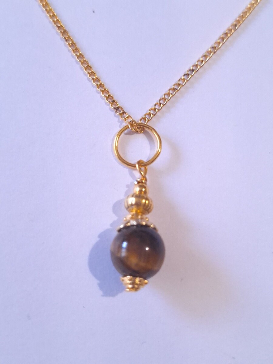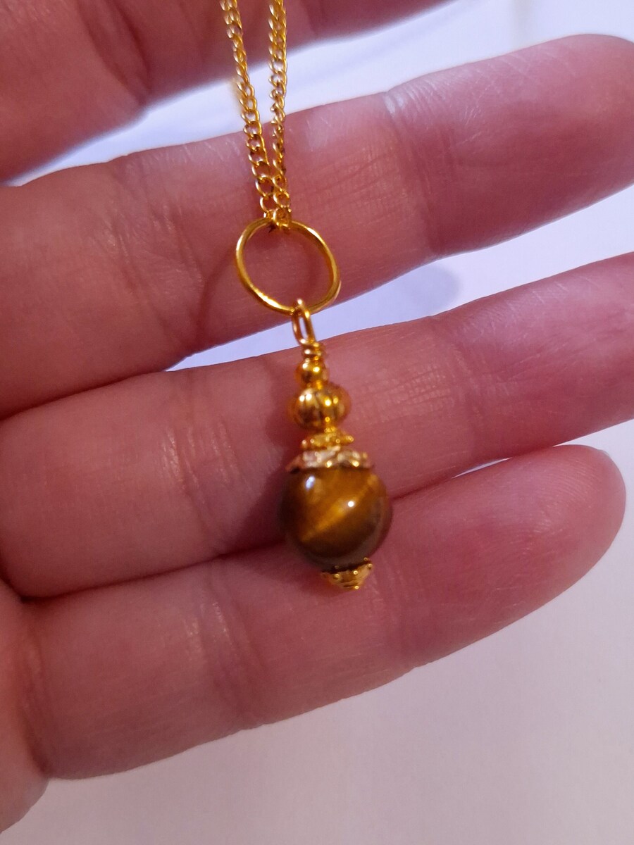 Material: gold toned metal ornament,Genuine Tiger's eye gemstone, gold-tone brass chain.