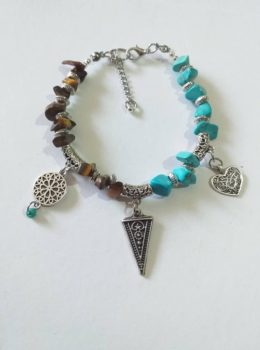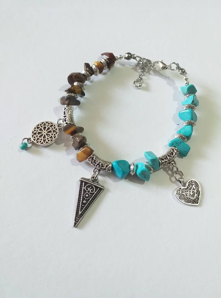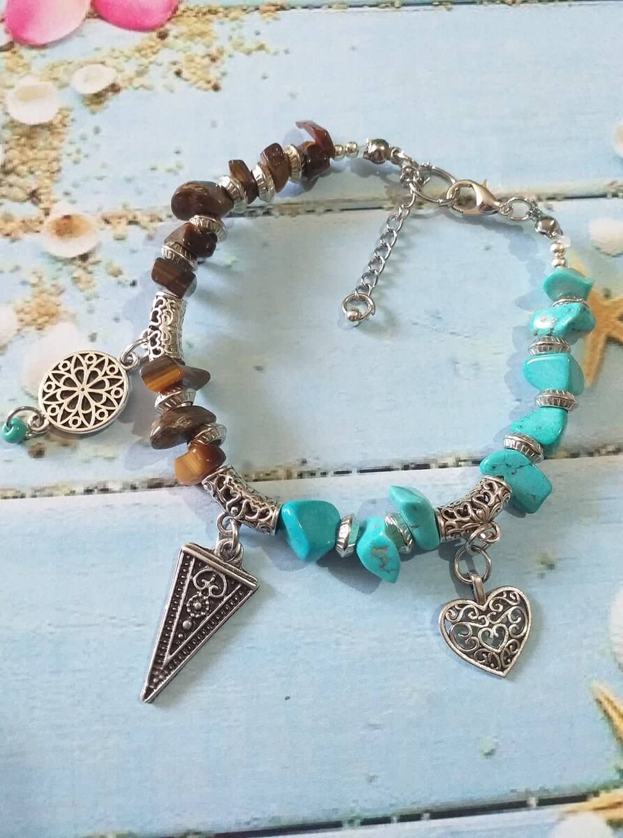 Victorian filigree silver tone gemstones Tiger eye and Turquoise and silver tone beads Unique bracelet . Silver-tone , blue and brown bracelet . Tiger eye bracelet . Turquoise bracelet . Gemstone Boho bracelet . Bohemian bracelet . Vintage style bracelet. Antique style bracelet . Heart charms bracelet. Oriental style Princess style bracelet. Edwardian style bracelet.