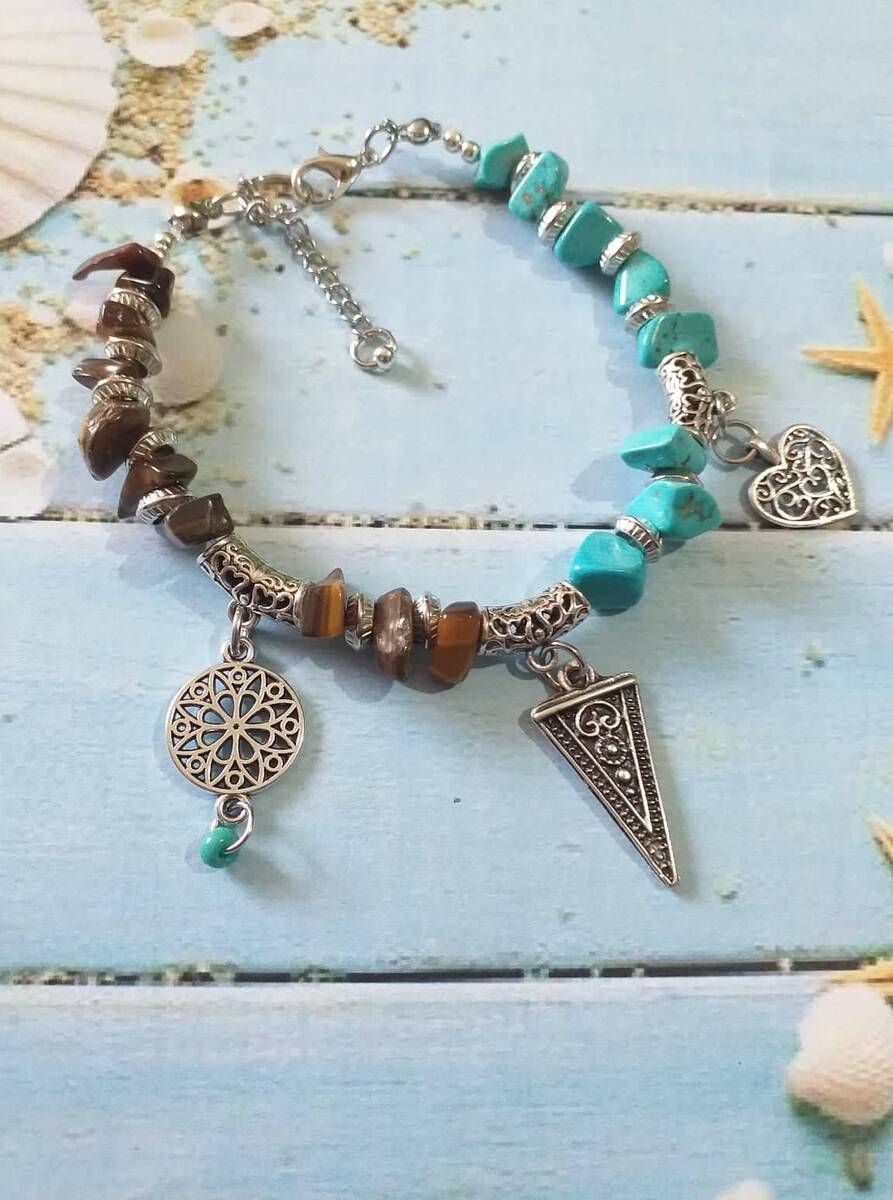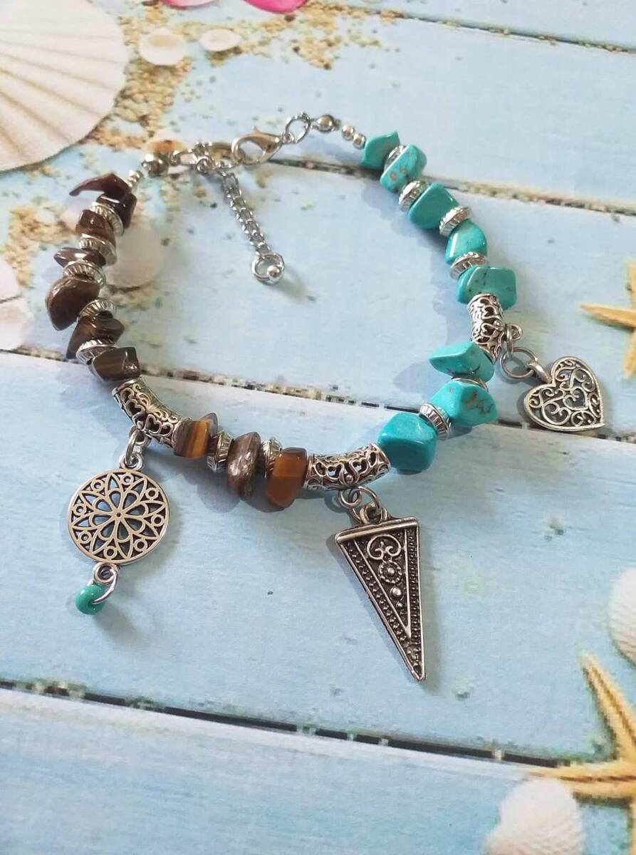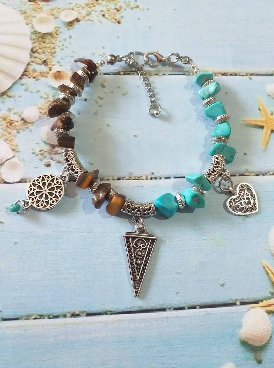 Victorian filigree silver tone gemstones Tiger eye and Turquoise and silver tone beads Unique bracelet . Silver-tone , blue and brown bracelet . Tiger eye bracelet . Turquoise bracelet . Gemstone Boho bracelet . Bohemian bracelet . Vintage style bracelet. Antique style bracelet . Heart charms bracelet. Oriental style Princess style bracelet. Edwardian style bracelet.