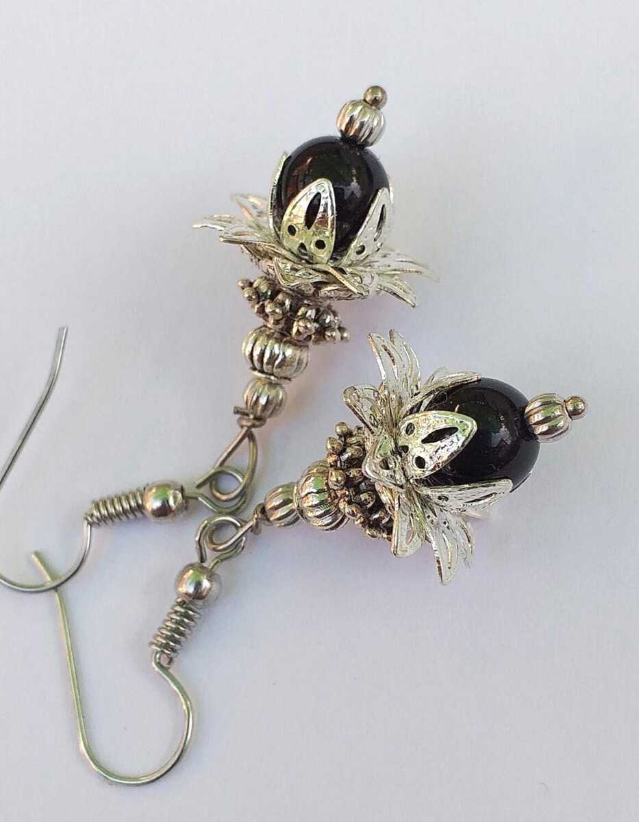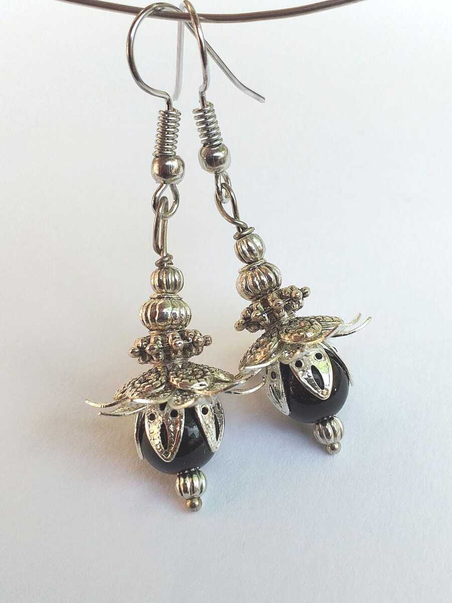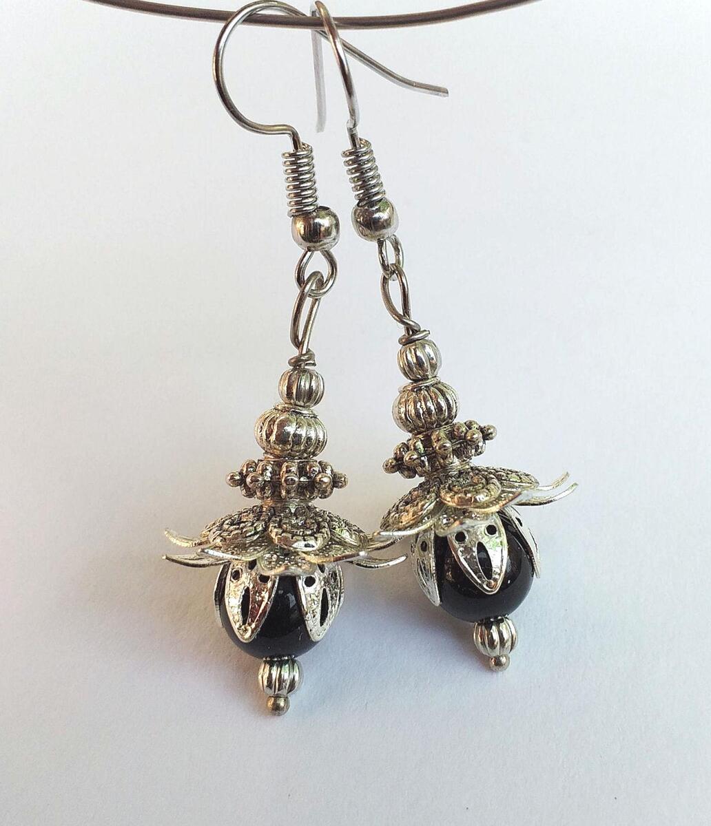 Materials: silver-toned ornament beads and caps, black plastic beads