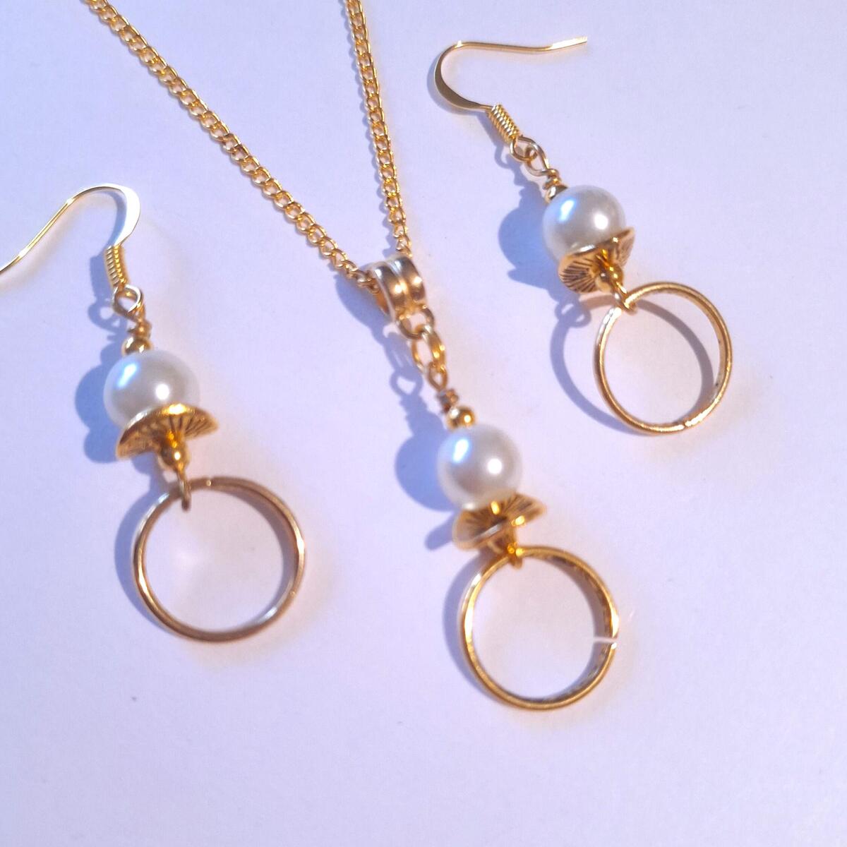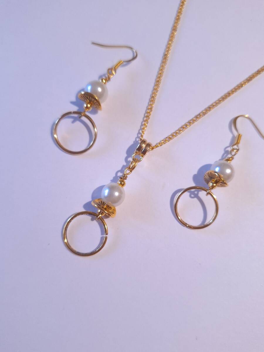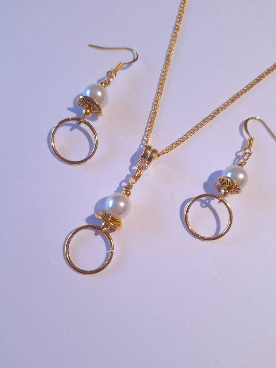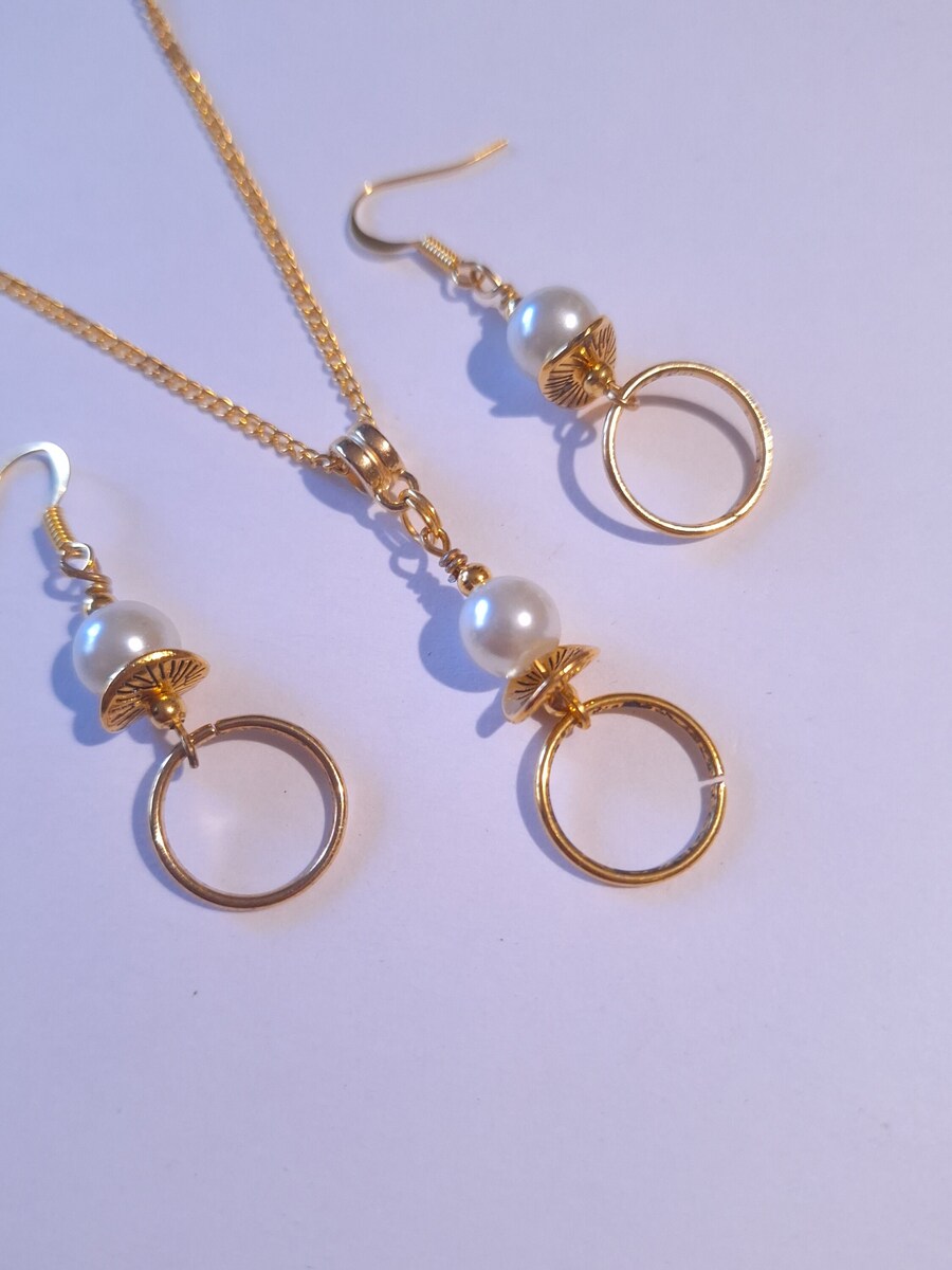 Beautiful Set of gold tone hoop and ornaments and crystal white pearls pendant necklace and earrings. Antique style gold tone set necklace and earrings with hoops. Boho necklace . Boho jewelry set . Boho pearl earrings . Bohemian necklace and earrings . Birthday set necklace and earrings . Bridal jewelry set. Jewelry set for wedding. Birthday gift set.