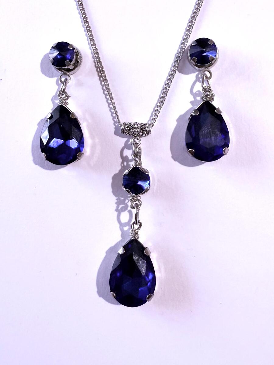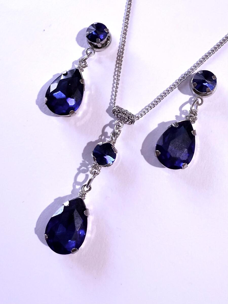 Beautiful Set of silver-tone Antique style dark blue round and teardrop shaped glass faceted cabochons on the silver-tone metal base necklace and earrings. Silver-tone pendant Victorian style necklace and earrings. Boho necklace. Bohemian necklace and earrings. Romantic necklace and earrings.