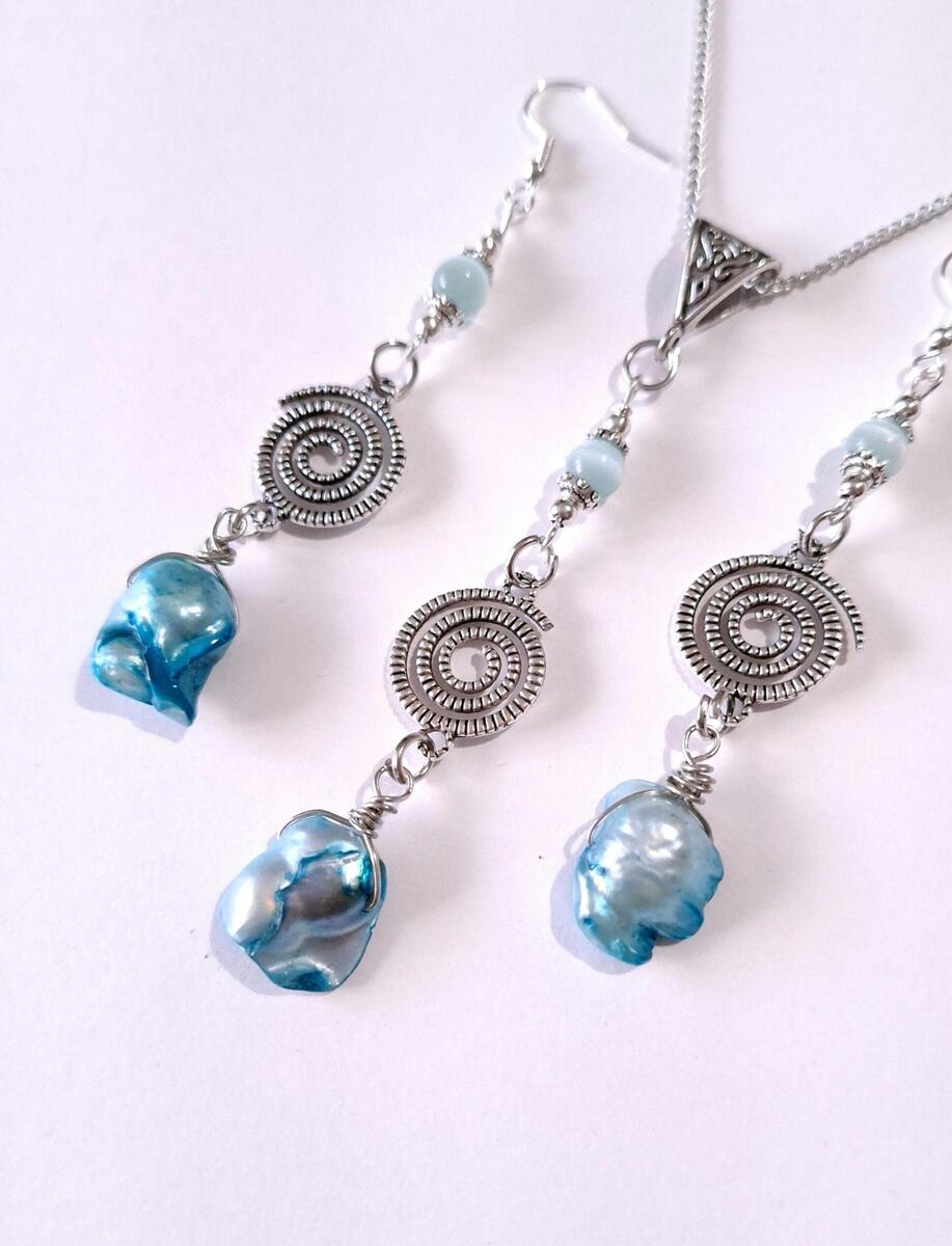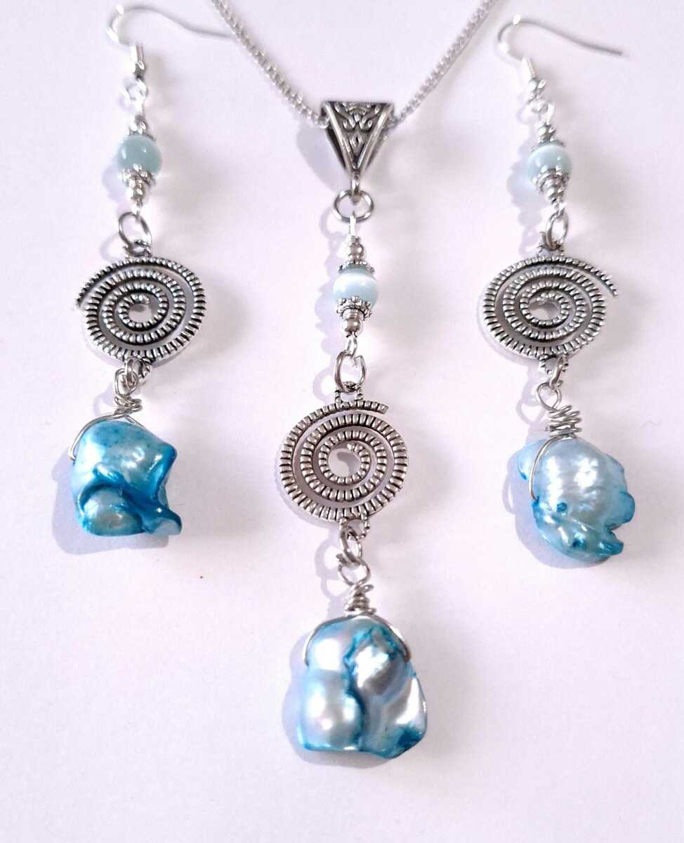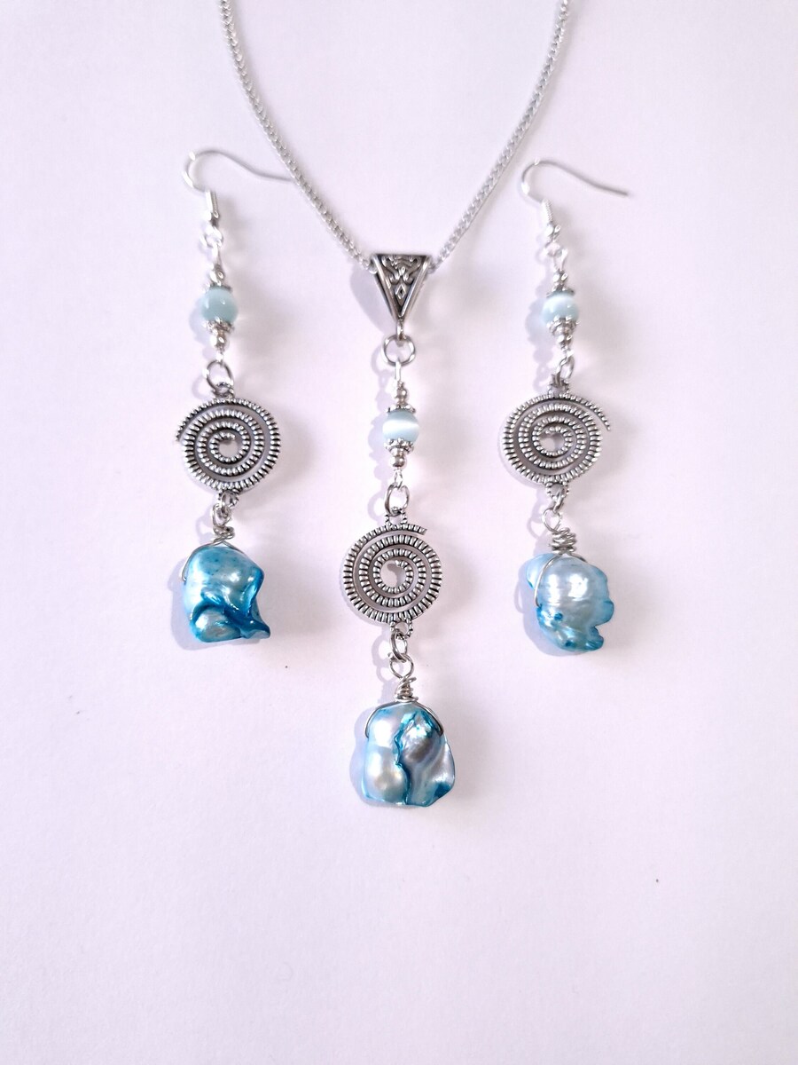 Beautiful Set of silver-tone spiral Antique style and unique blue freshwater pearls and amazing blue Chrysoberyl necklace and earrings . Silver tone pendant Victorian style necklace and earrings . Boho necklace . Bohemian necklace and earrings . Romantic necklace and earrings . Beautiful necklace with same style earrings with pearls and gemstones.