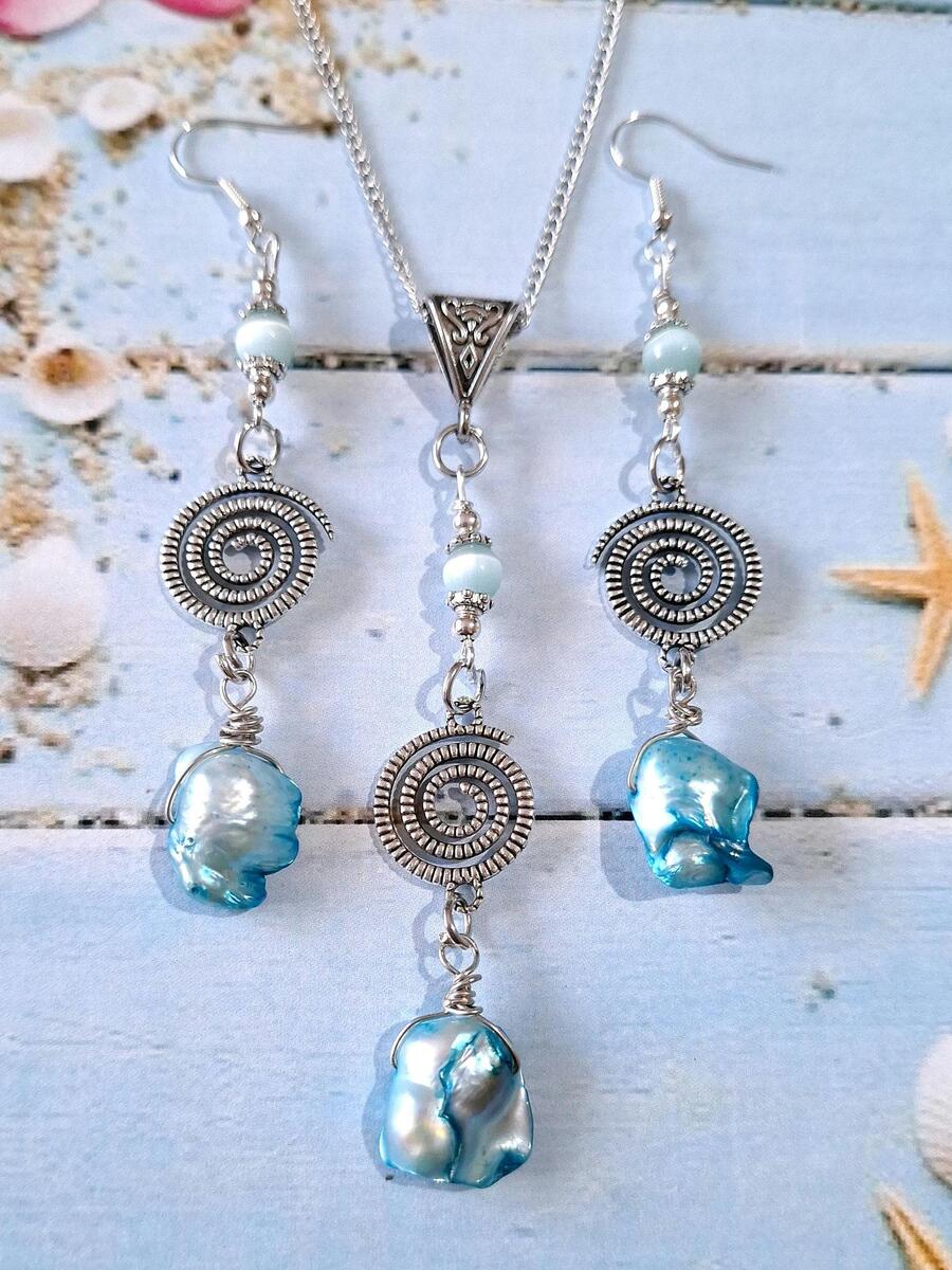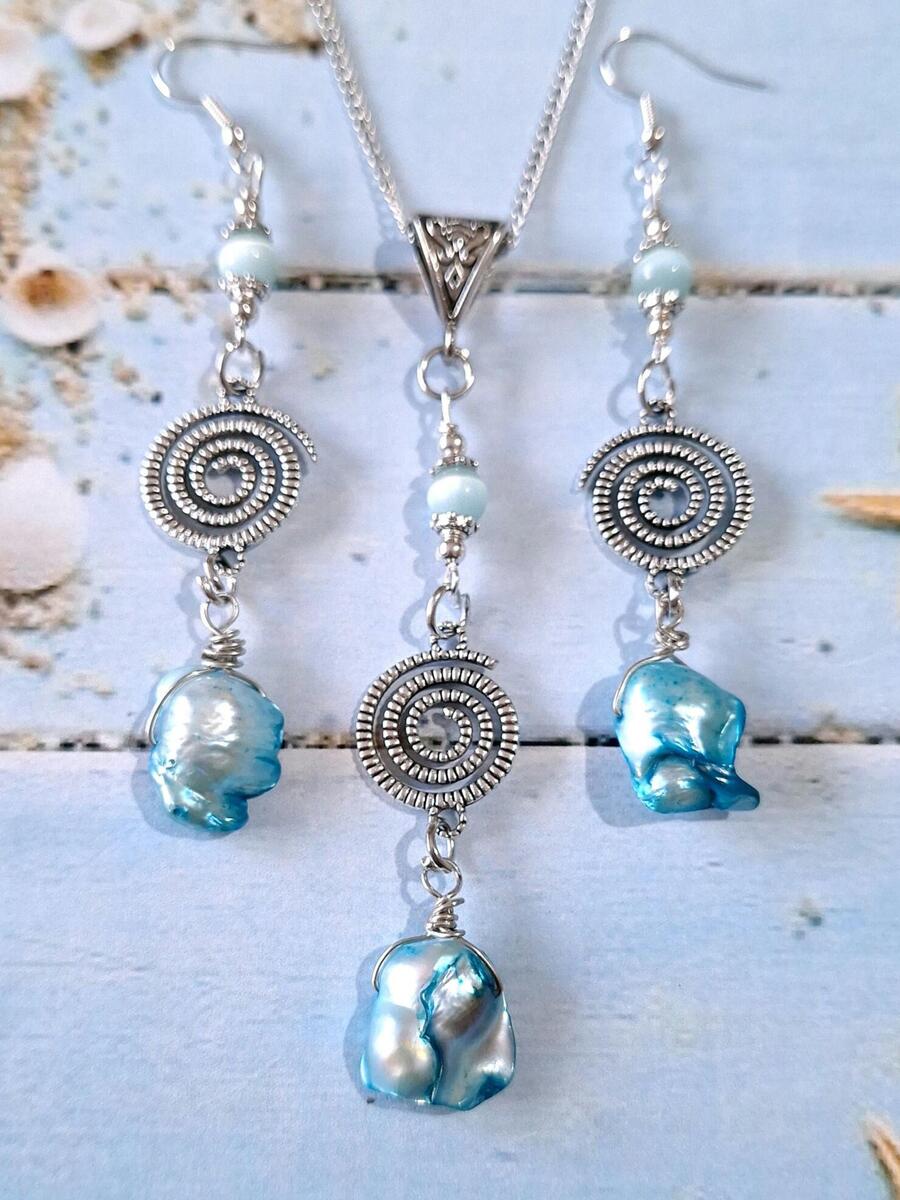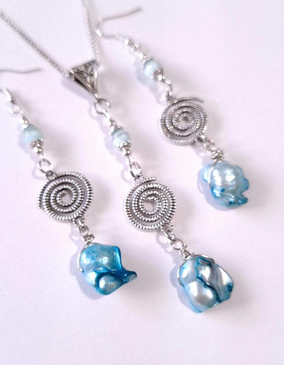 Beautiful Set of silver-tone spiral Antique style and unique blue freshwater pearls and amazing blue Chrysoberyl necklace and earrings . Silver tone pendant Victorian style necklace and earrings . Boho necklace . Bohemian necklace and earrings . Romantic necklace and earrings . Beautiful necklace with same style earrings with pearls and gemstones.