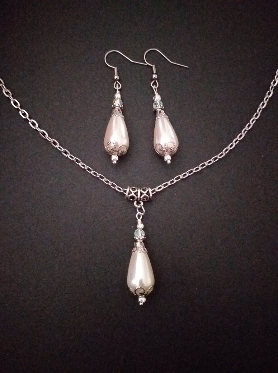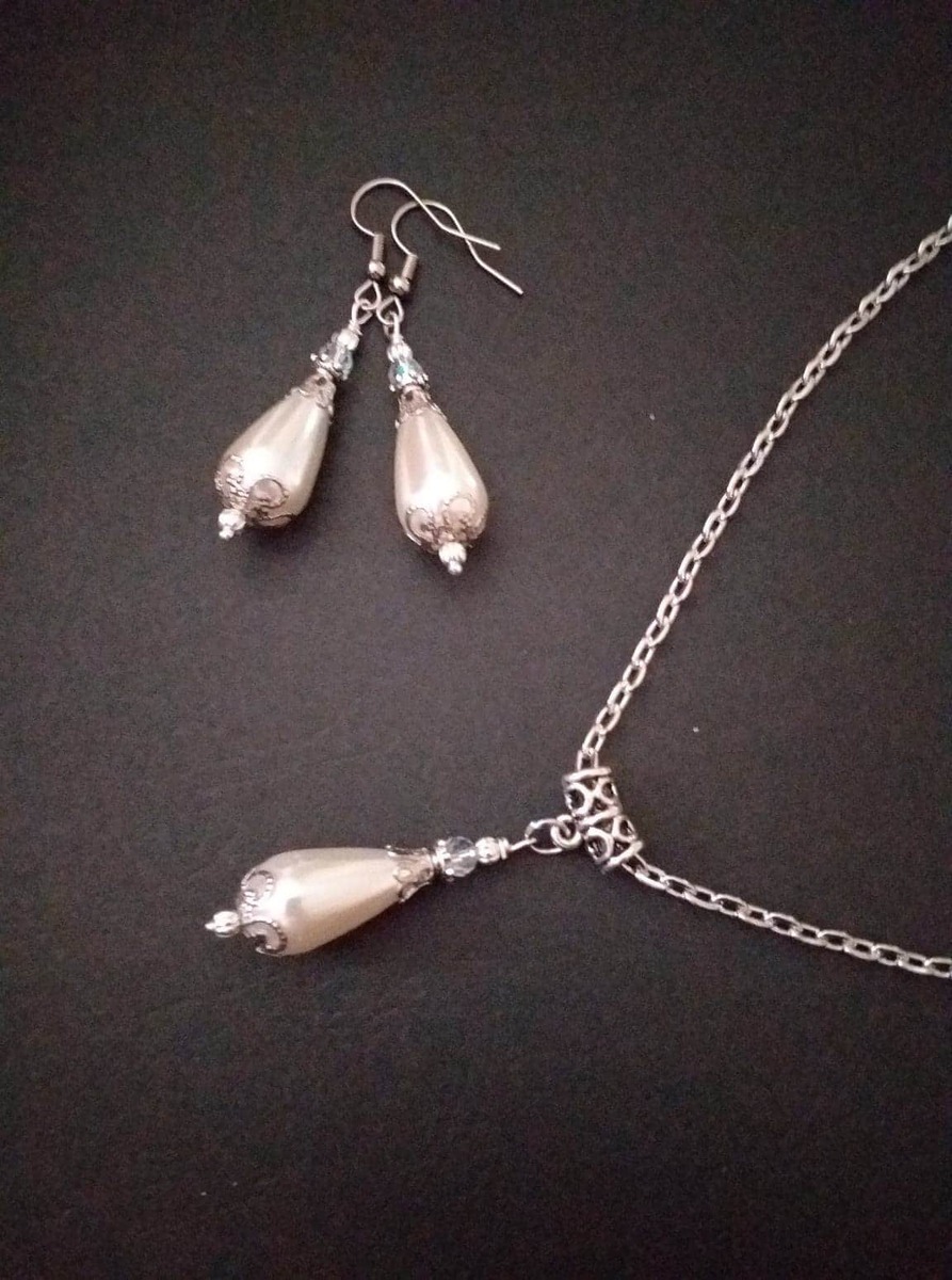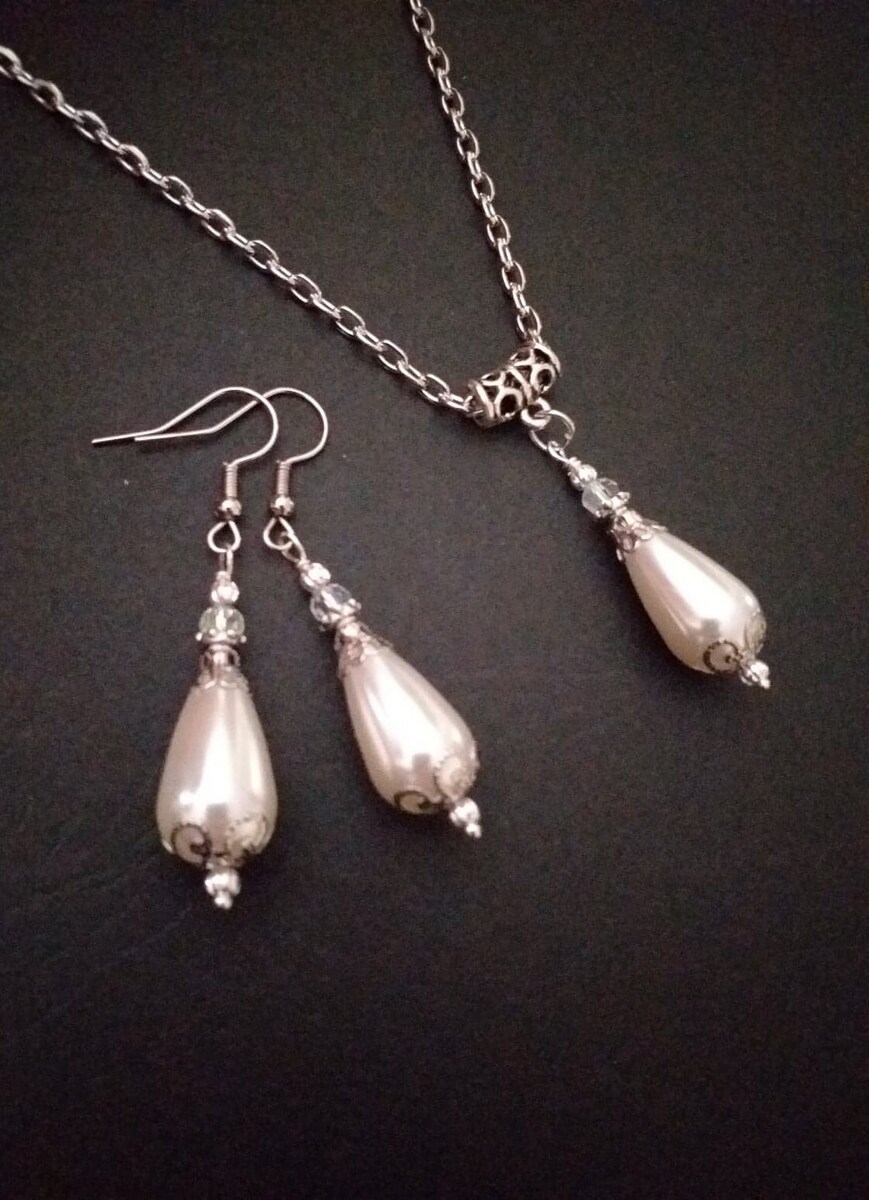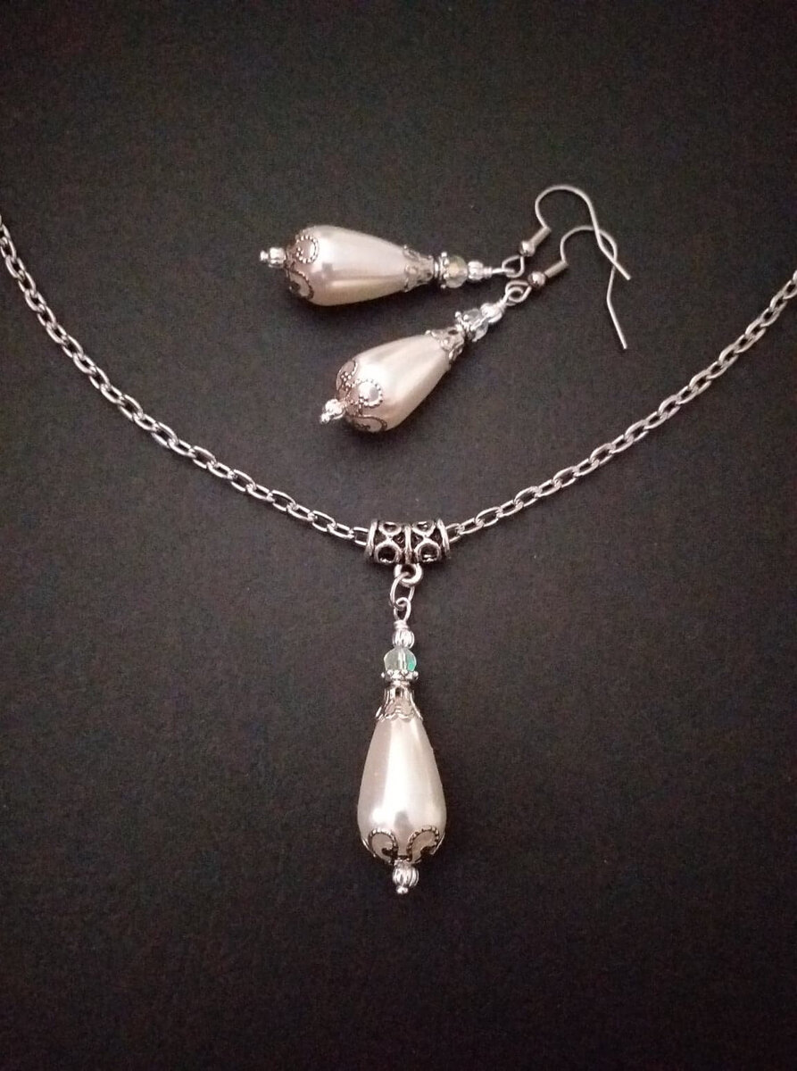 Beautiful Set of fine filigree silver-tone Antique style ornaments and big teardrop shaped plastic pearls beads necklace and earrings . Silver tone pendant Victorian style necklace and earrings . Boho necklace . Bohemian necklace and earrings . Romantic necklace and earrings . Beautiful necklace with same style earrings with crystal and plastic pearls beads. Wedding jewelry set. Bridal jewelry set.