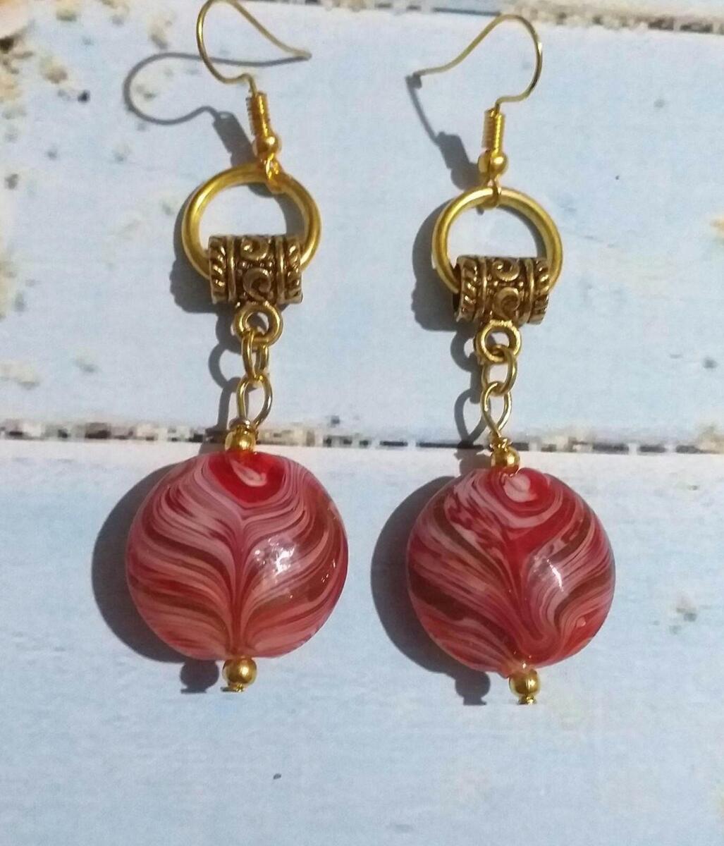 Bohemian set gold set Handmade Murano red-white-gold glass beads set earrings and necklace . Bohemian jewelry set . Gothic jewelry set. Gothic wedding set. Red gothic set.