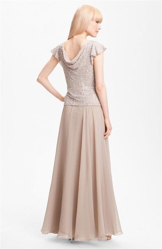 A sparkling assortment of myriad shaped sequins light up the cowl neck, flutter sleeve bodice of a floor-sweeping gown with a lushly flared chiffon skirt.