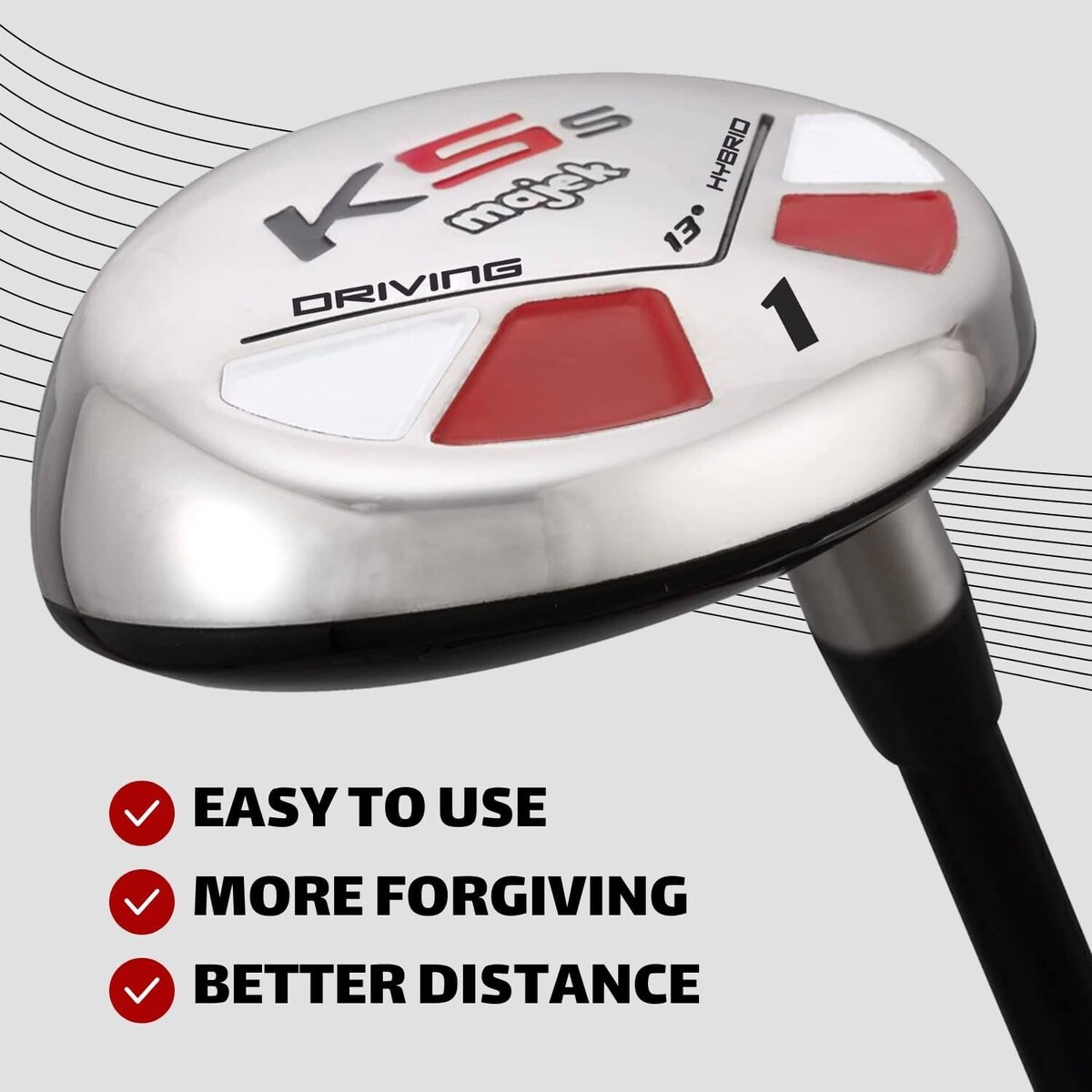 Replace Your Entire Difficult To Use Iron Set With The Majek K5 All Hybrid Iron Majekally Improve Your Hybrid-Iron Game!!! Pure Golf Engineering: Majek Hybrid was Co-Engineered by members of an elite engineering group. This unique relationship and pure engineering approach created the Majek All Hybrid Iron. Benefits of the Majek Hybrid: -More Weight Positioned Behind The "Sweet Spot" -Deeper Cavity Back Creates A Tighter Shot Dispersion, Which Increases The Accuracy On Off Center Hits. -Aerodynamic Design Creates A Reduction In Drag, Which Leads To Higher Club Head Speeds -Wide To Thin Crown Design Creates A Lower CG To Promote Higher Launch Angle For More Distance -Lightweight Premium Graphite Shaft Promotes Faster Swing Speed For Greater Distance. -Black Crown And Arrow Markers Make Alignment Easy And Eliminates Glare. Support A Local Company: Your Custom Made Majek Golf Hybrid Is Assembled By Hand In Riverside, CA, USA And Delivered Direct To Your Door.