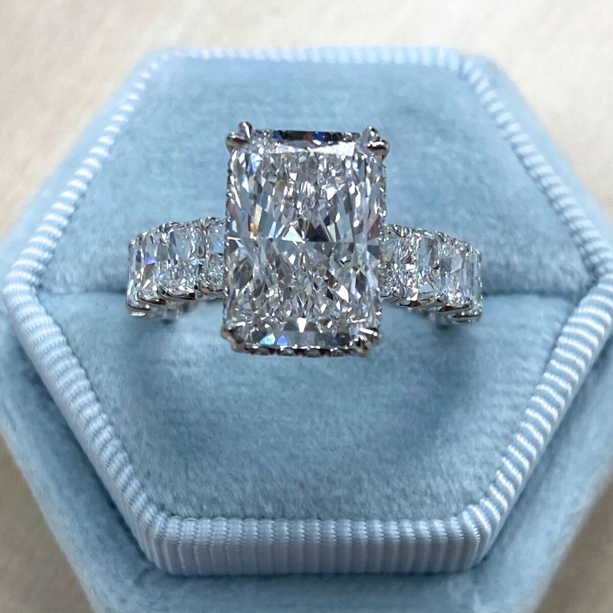 La bague de fiancailles en diamant cultive en laboratoire de taille brillant radiant certifiee IGI est magnifique ! Cette bague particuliere comporte un diamant de laboratoire d'un poids total de 7,52 carats (TCW) dans une taille brillant rayonnant comme piece maîtresse. De plus, le diamant de laboratoire taille radiant est complete par des diamants de laboratoire lateraux plus petits de 3,07 carats, rehaussant sa brillance et son elegance globales !!!